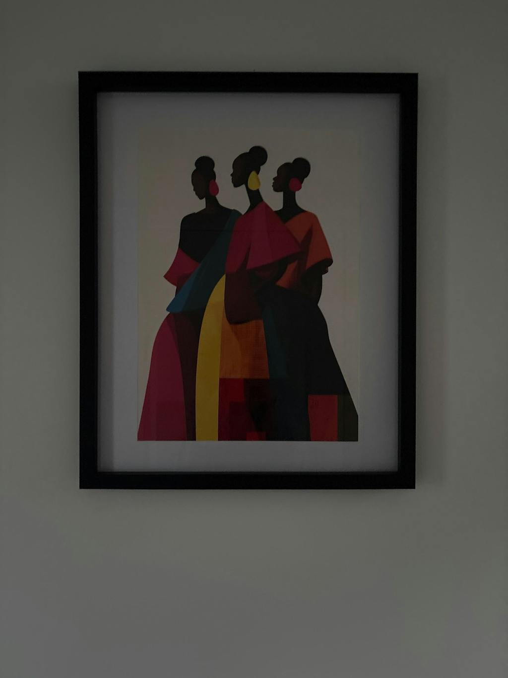 This striking art print features three elegantly posed figures in a bold, modern style, adorned with vibrant geometric patterns inspired by african print and rich hues against a vivid beige backdrop. The composition exudes confidence and unity, making it a captivating addition to any contemporary art collection.