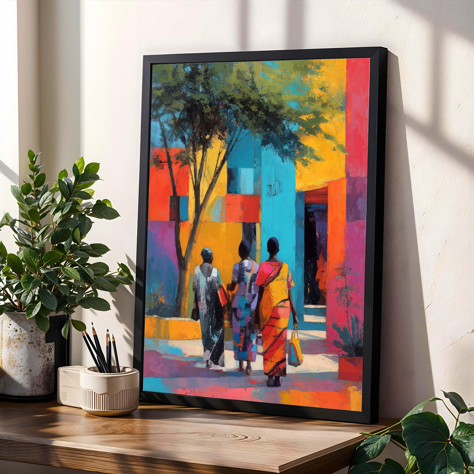 Bring life, colour, and culture into your space with this African market wall art print. Featuring women in bold patterned attire against a lively street scene, this piece captures the energy and vibrancy of everyday African life. With its rich tones and expressive brushstrokes, it makes a striking centrepiece for any room.