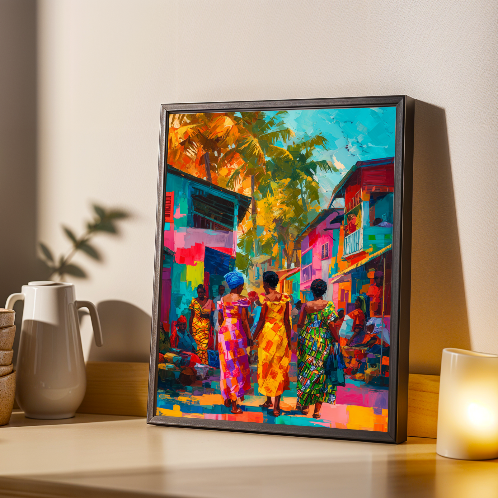 Celebrate heritage and colour with this bold Afrocentric market scene art print.