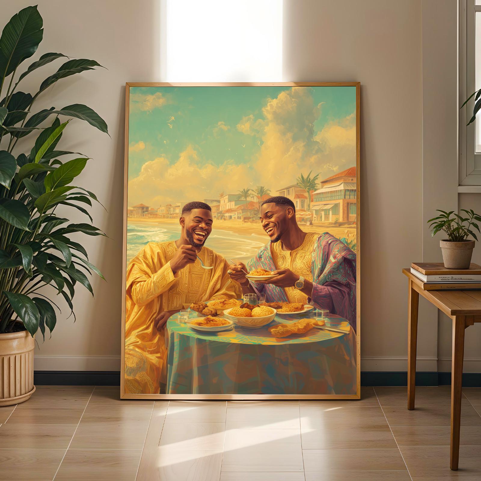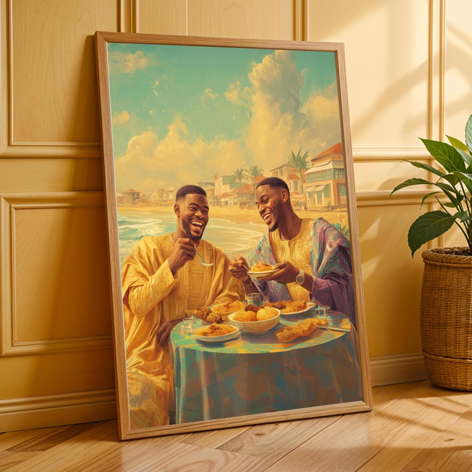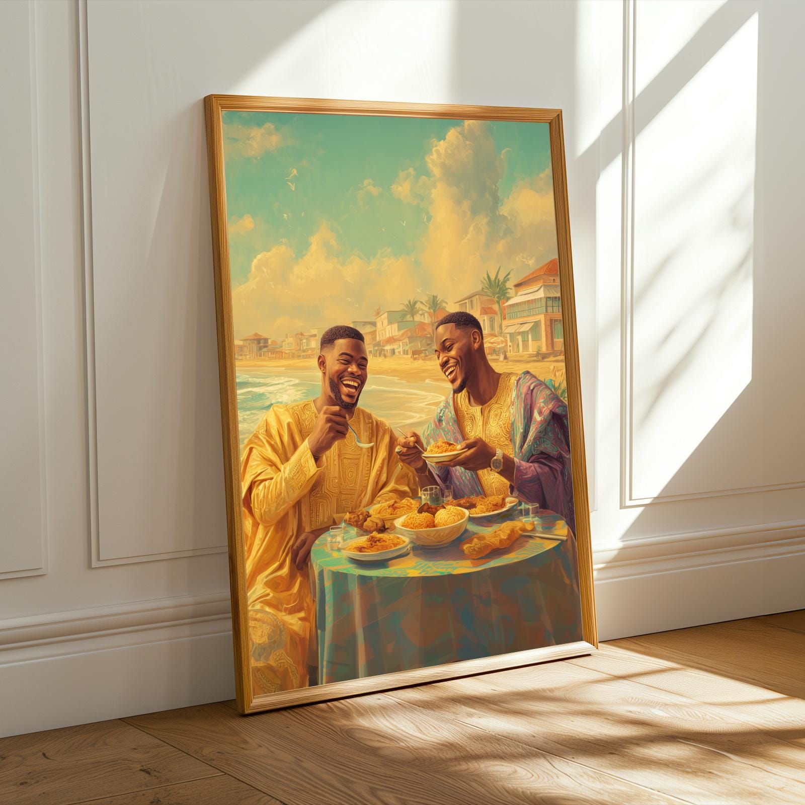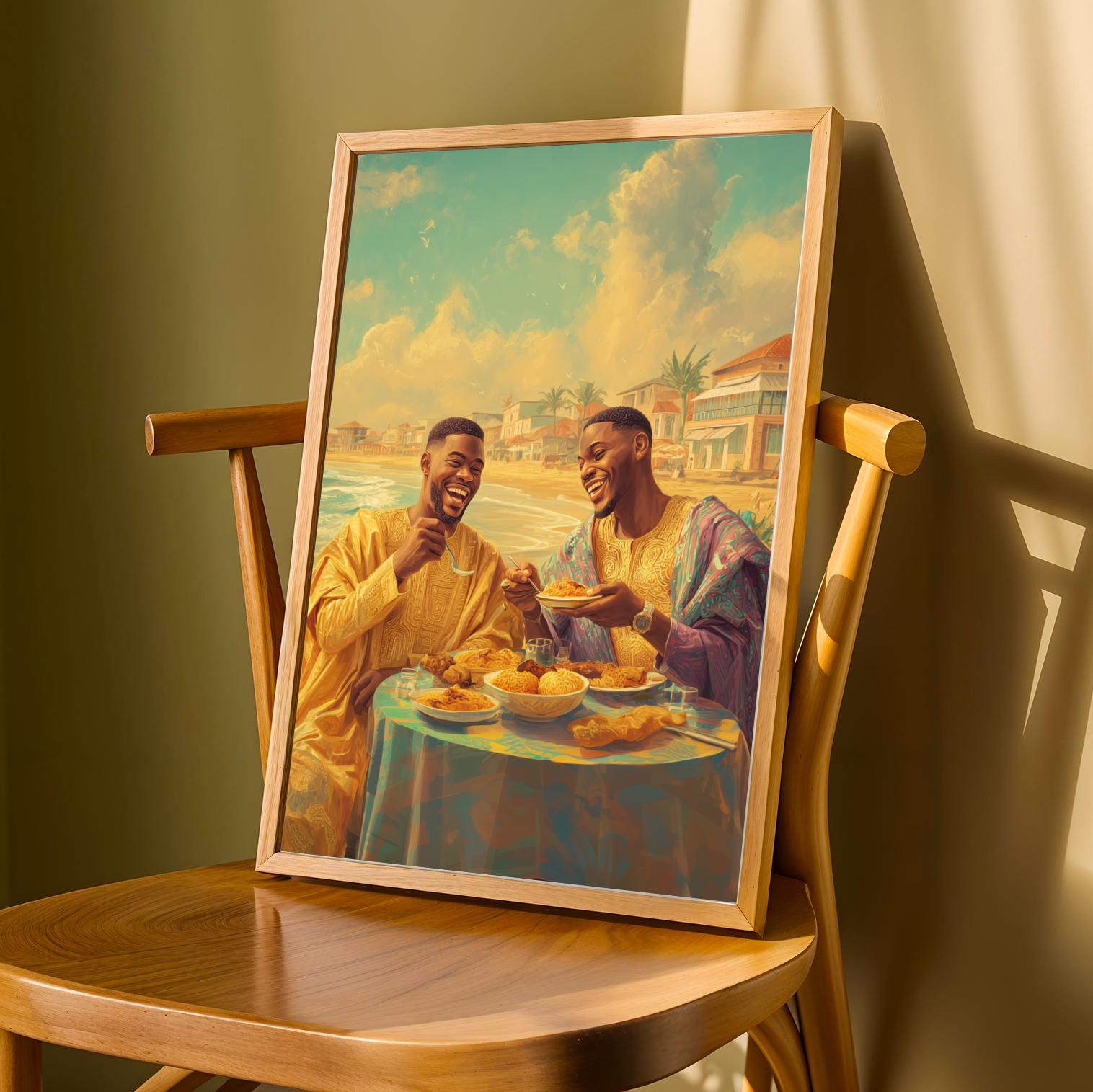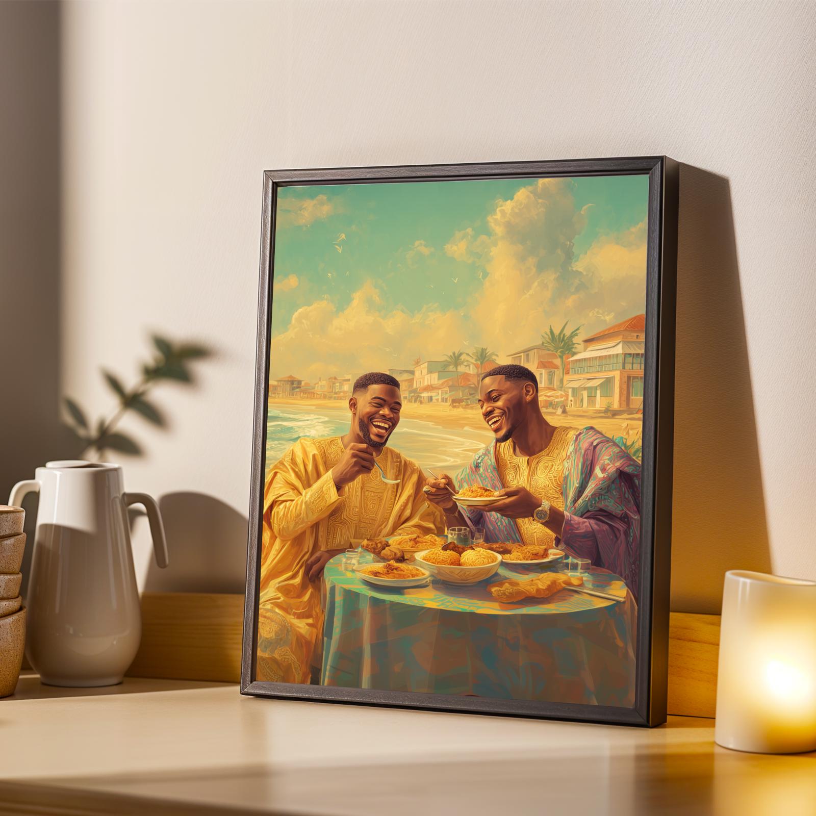 This vibrant art print captures the joyful essence of a beachside meal, featuring two friends sharing laughter over a colorful feast. The rich, warm tones and intricate details evoke a sense of warmth and camaraderie against a backdrop of serene coastal beauty.