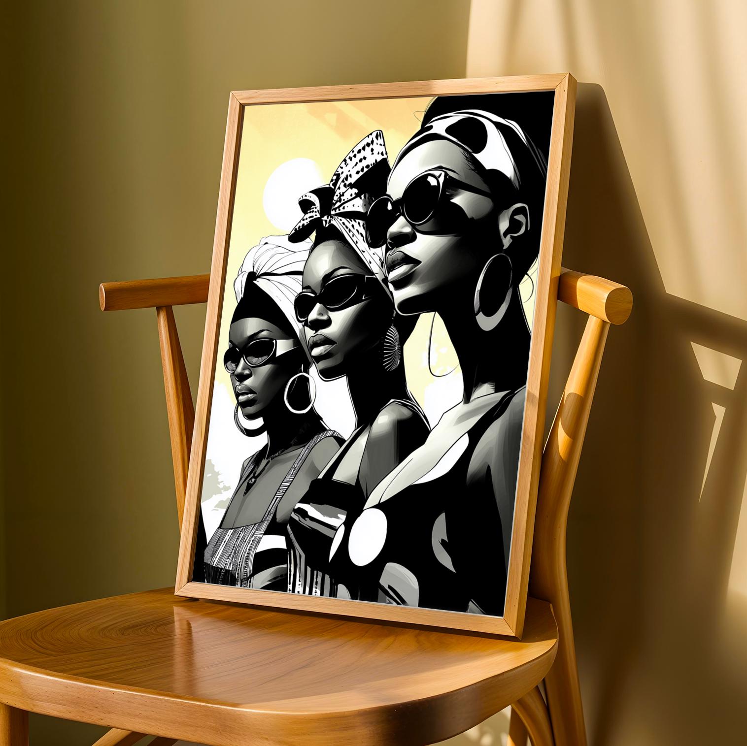 This striking art print captures the essence of bold femininity with three stylish women adorned in chic sunglasses and patterned headscarves, set against a warm, sunlit backdrop. The monochromatic palette and dynamic composition create an empowering and modern statement piece.
