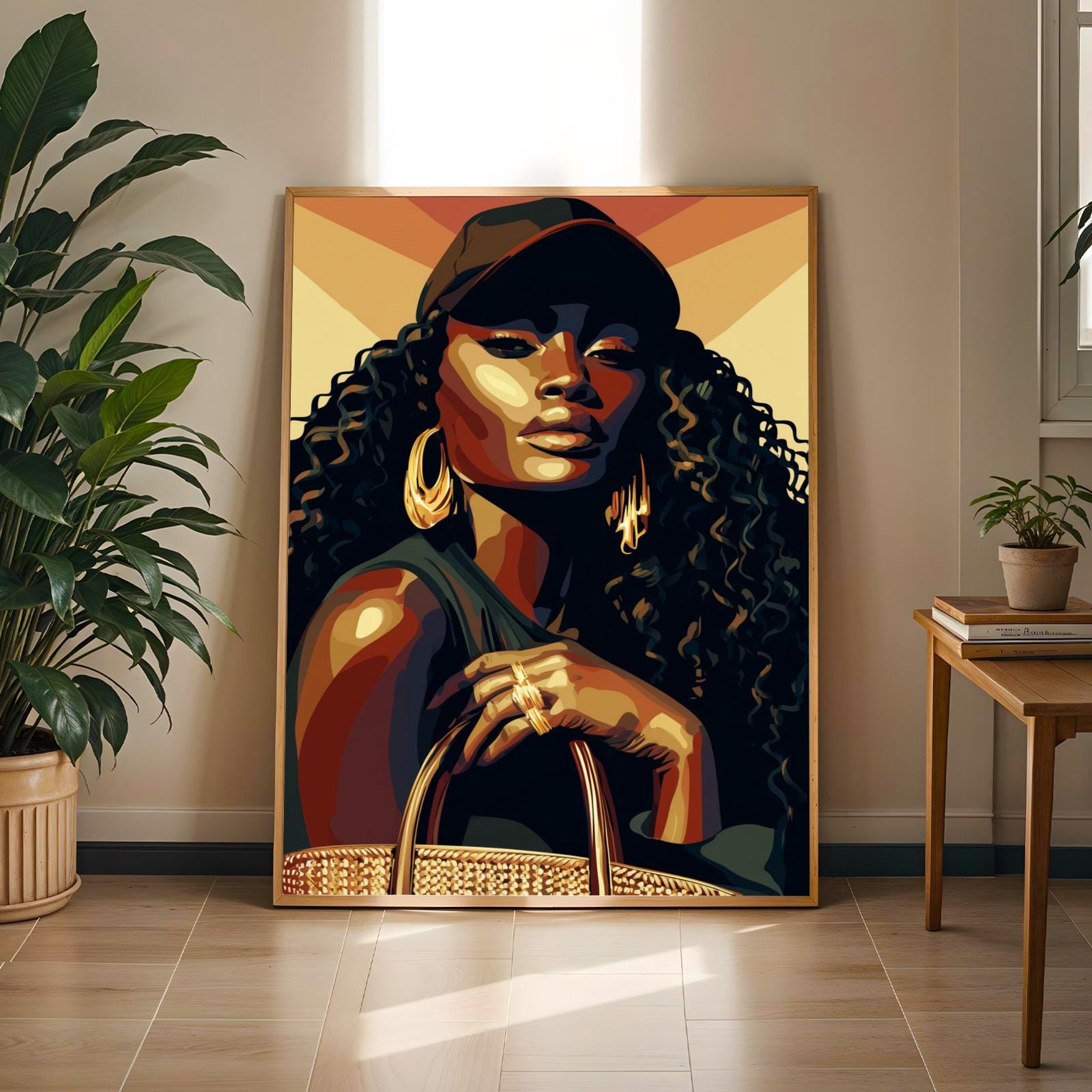 This captivating art print showcases a confident figure in a bold, graphic style, with rich, warm tones and striking contrast. The intricate details of the flowing curls and golden accessories add a touch of elegance and empowerment to any space.