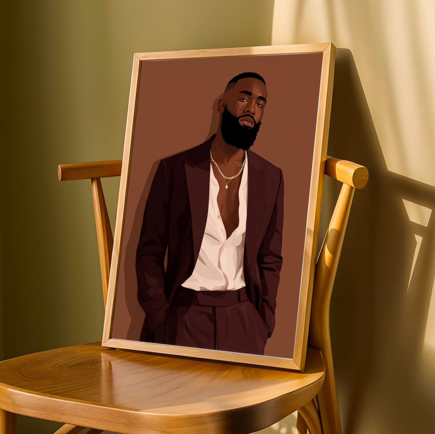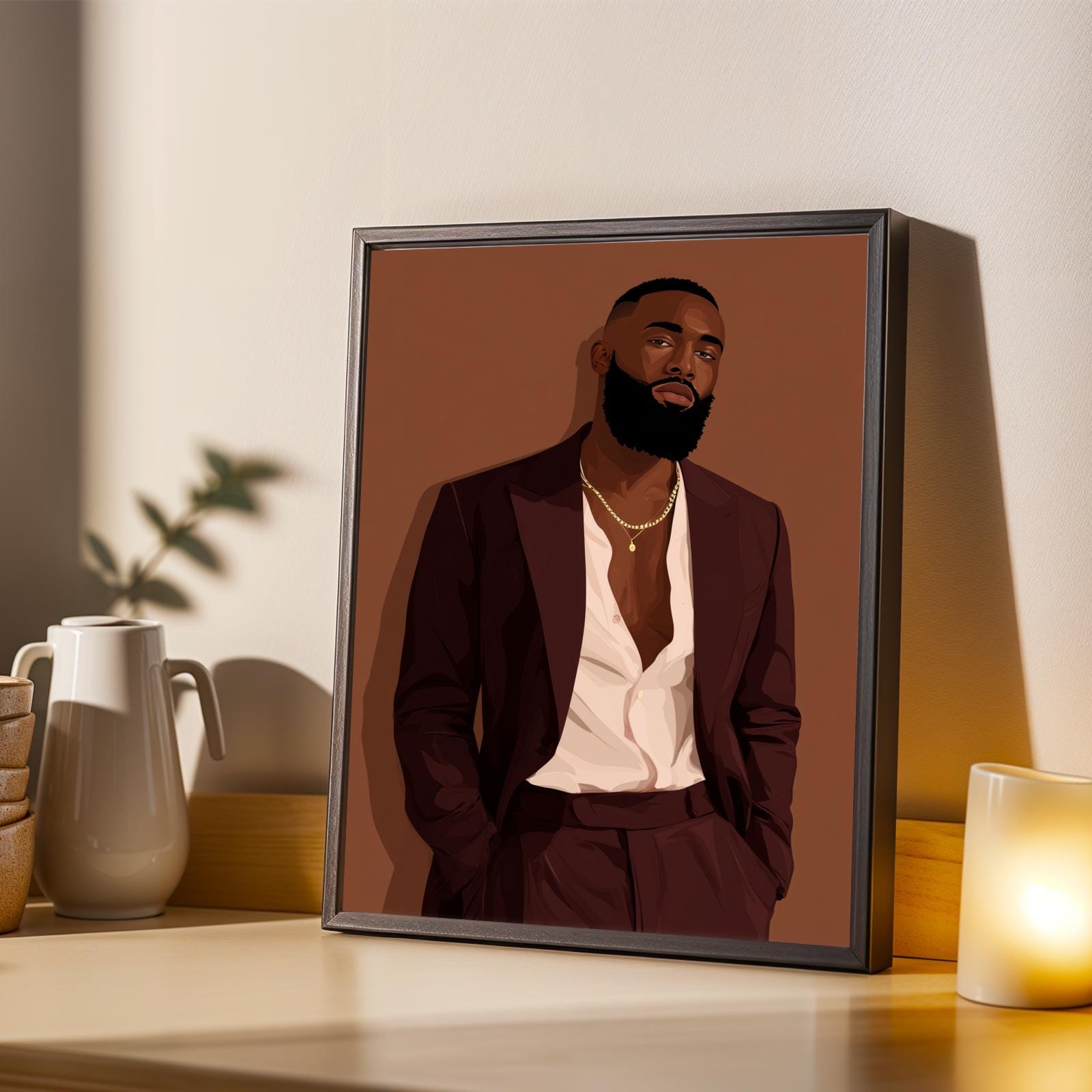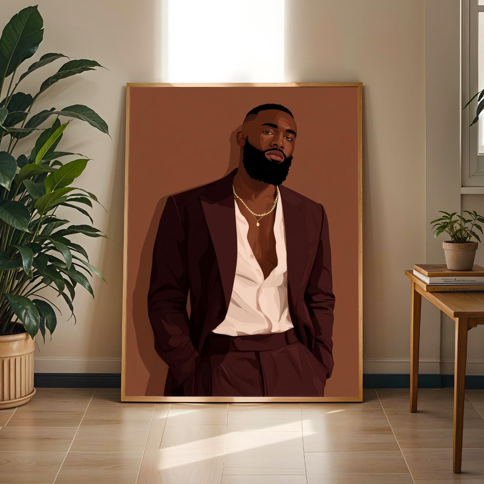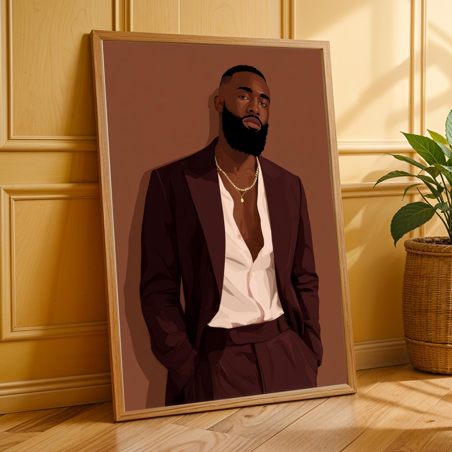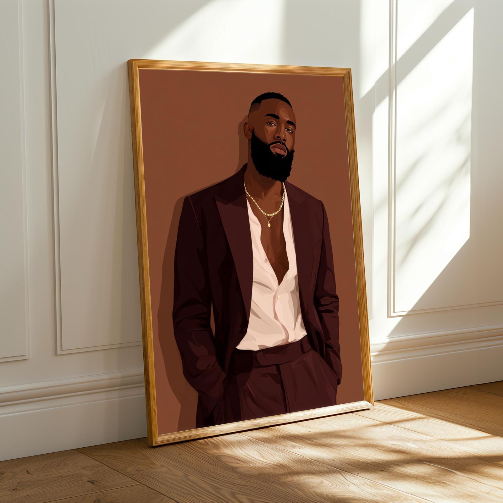 This striking art print captures a confident man in a deep burgundy suit against a warm brown backdrop, exuding sophistication and modern elegance. The bold use of color and clean lines create a stylish, contemporary portrait perfect for any chic interior.