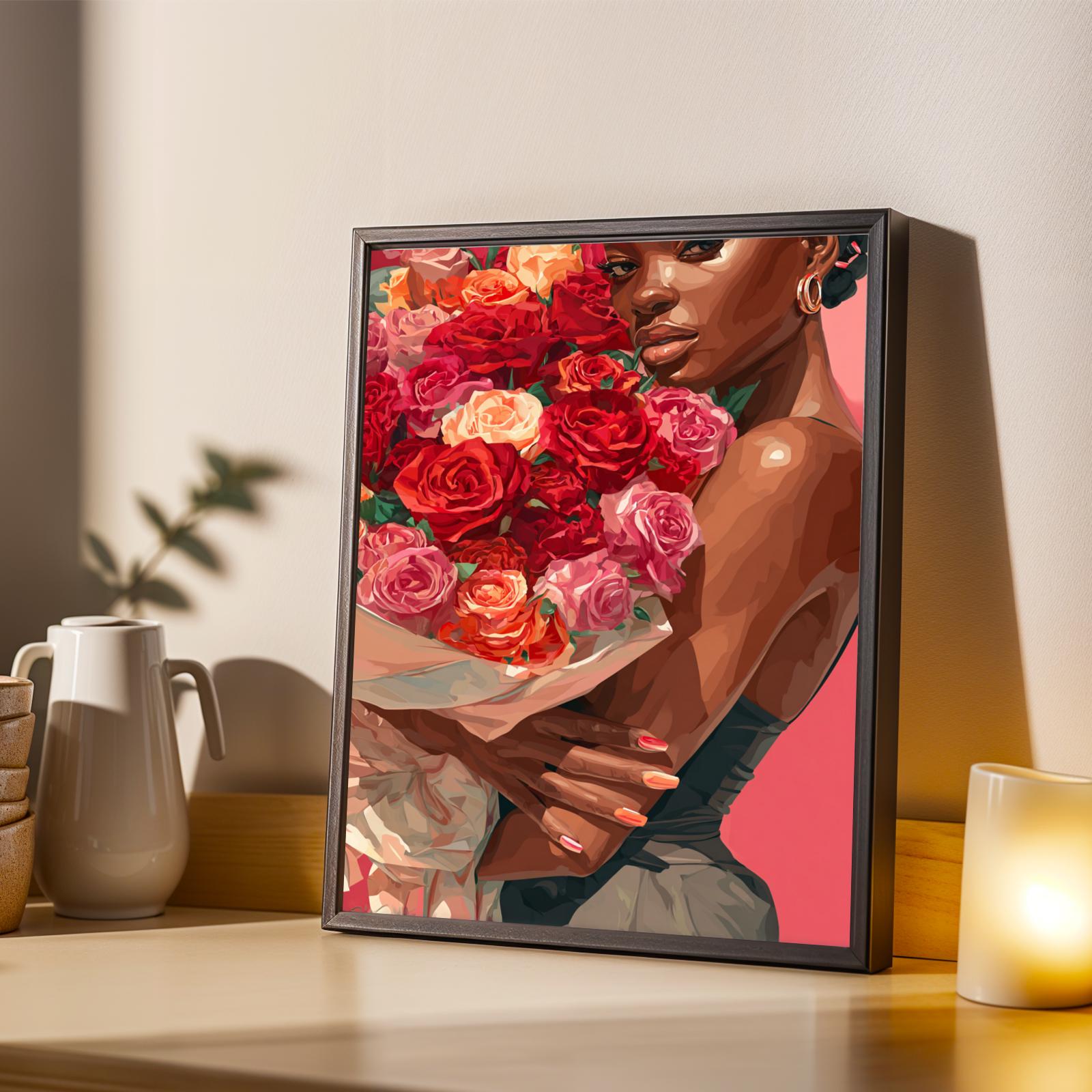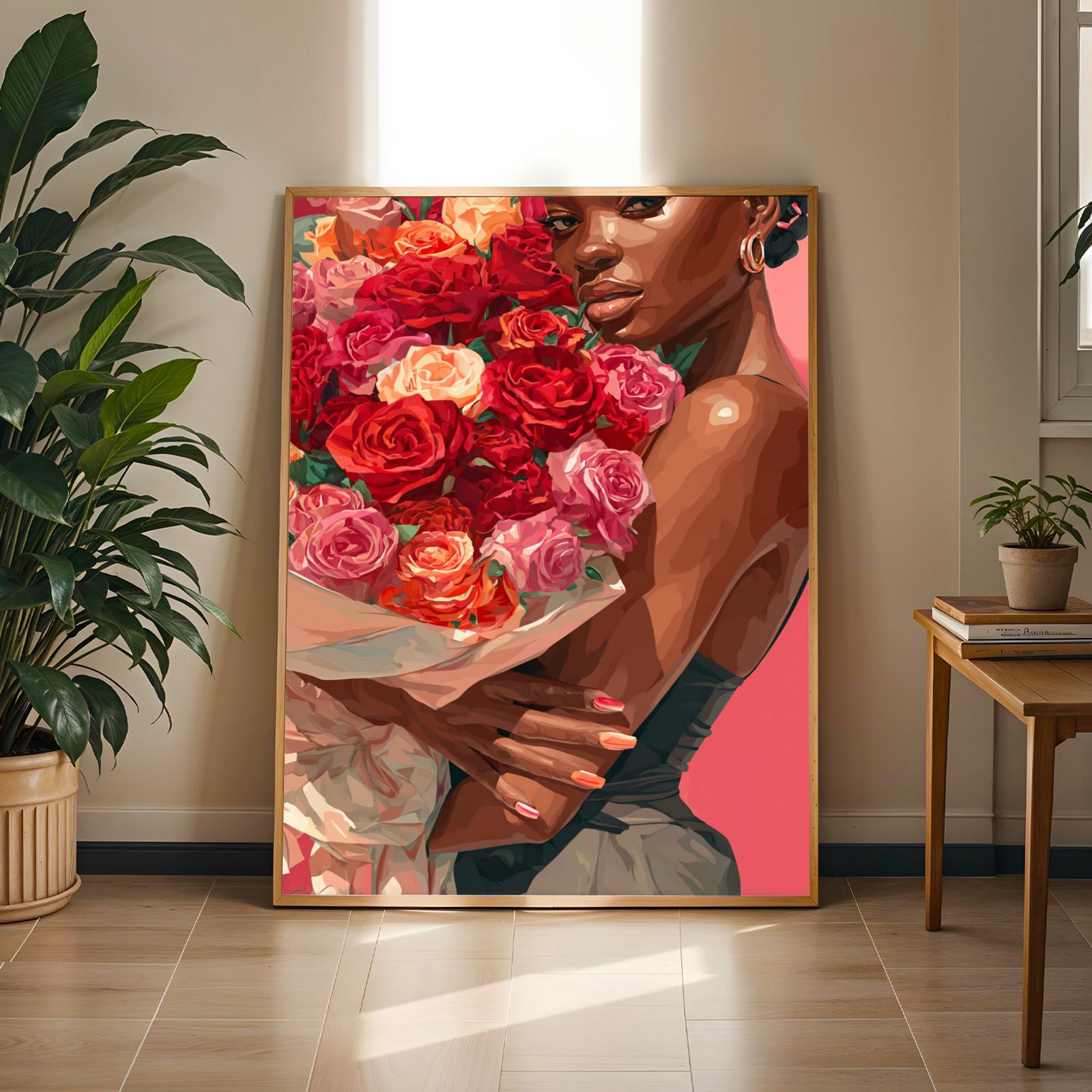 This striking art print captures a woman gracefully holding a vibrant bouquet of roses, rendered in a bold, contemporary style with rich, warm colors and dynamic brushstrokes. The composition exudes elegance and confidence, making it a captivating centerpiece for any space.