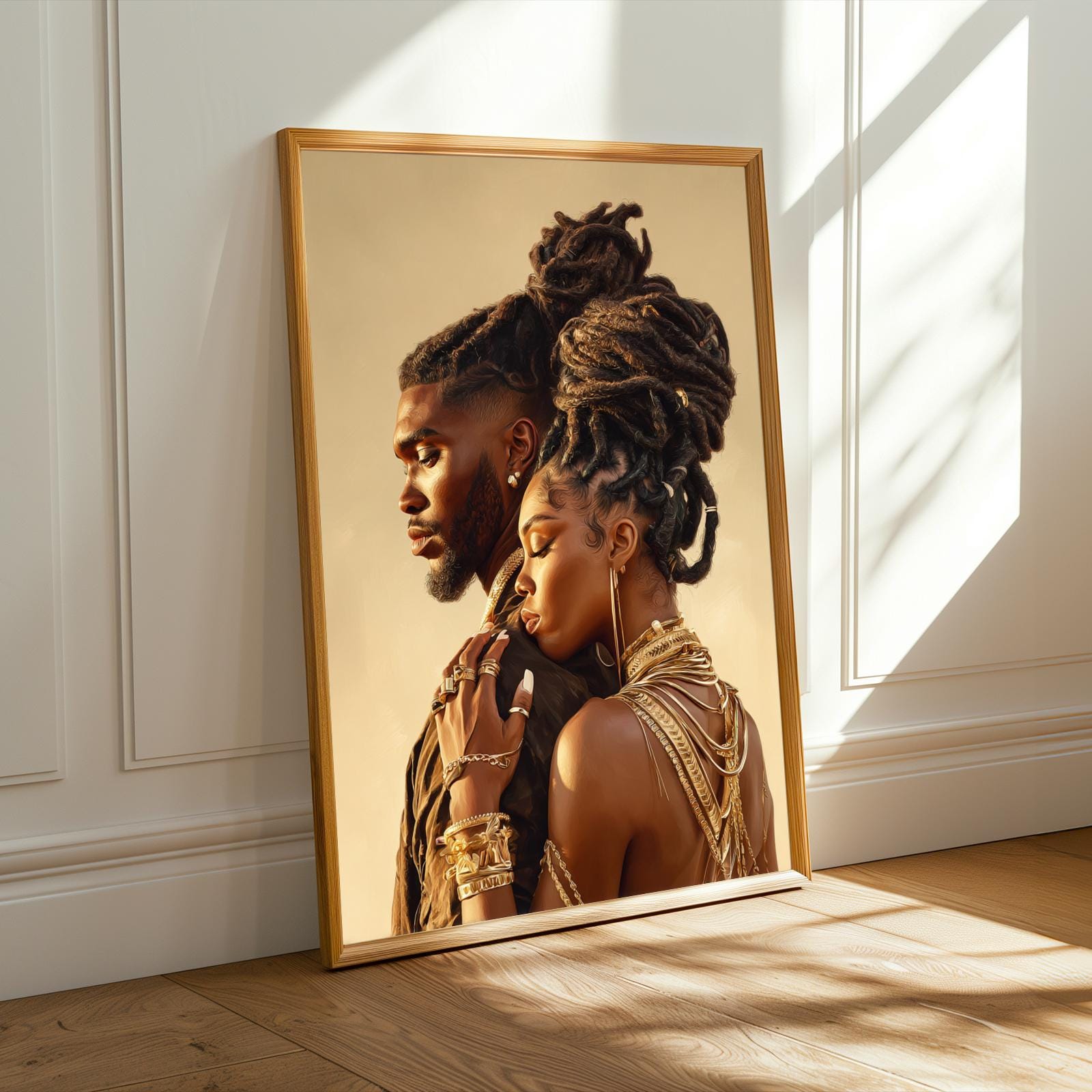 This striking art print captures an intimate moment between a couple adorned in luxurious gold jewelry, set against a warm, earthy backdrop. The piece exudes elegance and strength, highlighting intricate details and rich textures in a captivating, contemporary style.