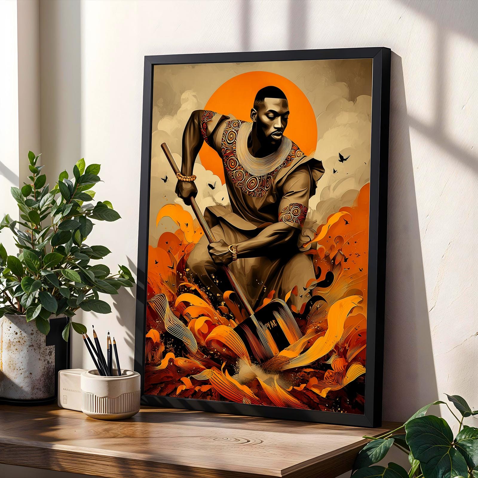 Immerse yourself in this dynamic art print featuring a powerful figure in motion, adorned in intricately patterned attire against a vibrant orange backdrop. The swirling elements and bold contrasts evoke a sense of strength and movement, creating a captivating visual experience.