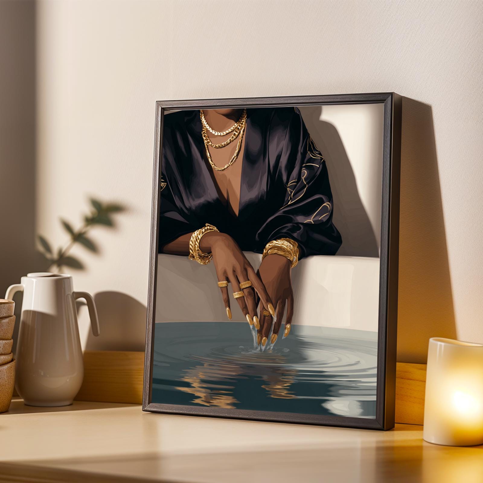 Sophisticated, bold, and unapologetically stylish, this stunning art print captures the essence of elegance and power. The artwork features a Black woman adorned with gold jewelry, dressed in chic black, relaxing with a glass of wine and surrounded by books. Perfect for anyone who wants to bring a touch of empowerment and luxury into their home.