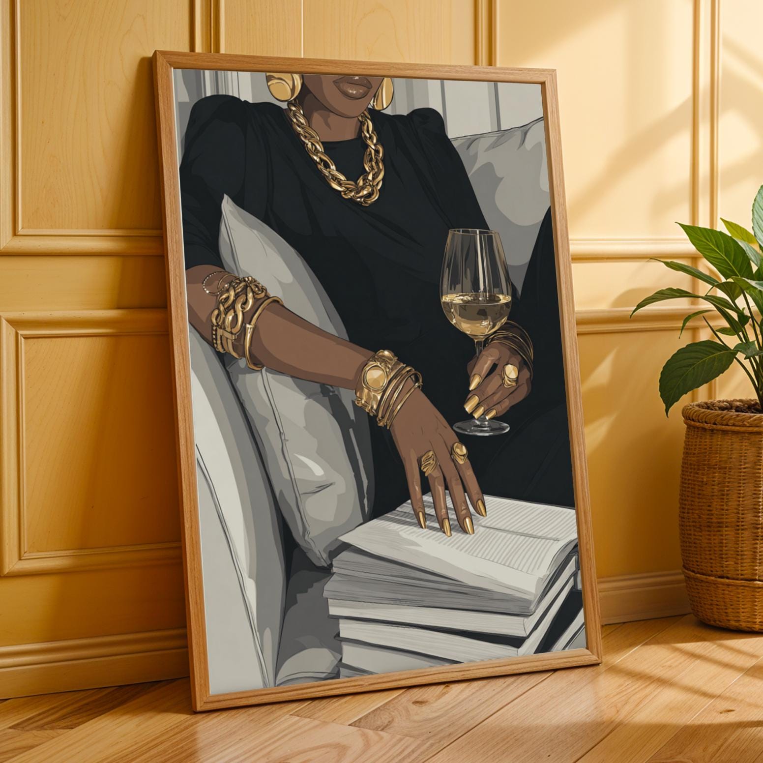 Sophisticated, bold, and unapologetically stylish, this stunning art print captures the essence of elegance and power. The artwork features a Black woman adorned with gold jewelry, dressed in chic black, relaxing with a glass of wine and surrounded by books.