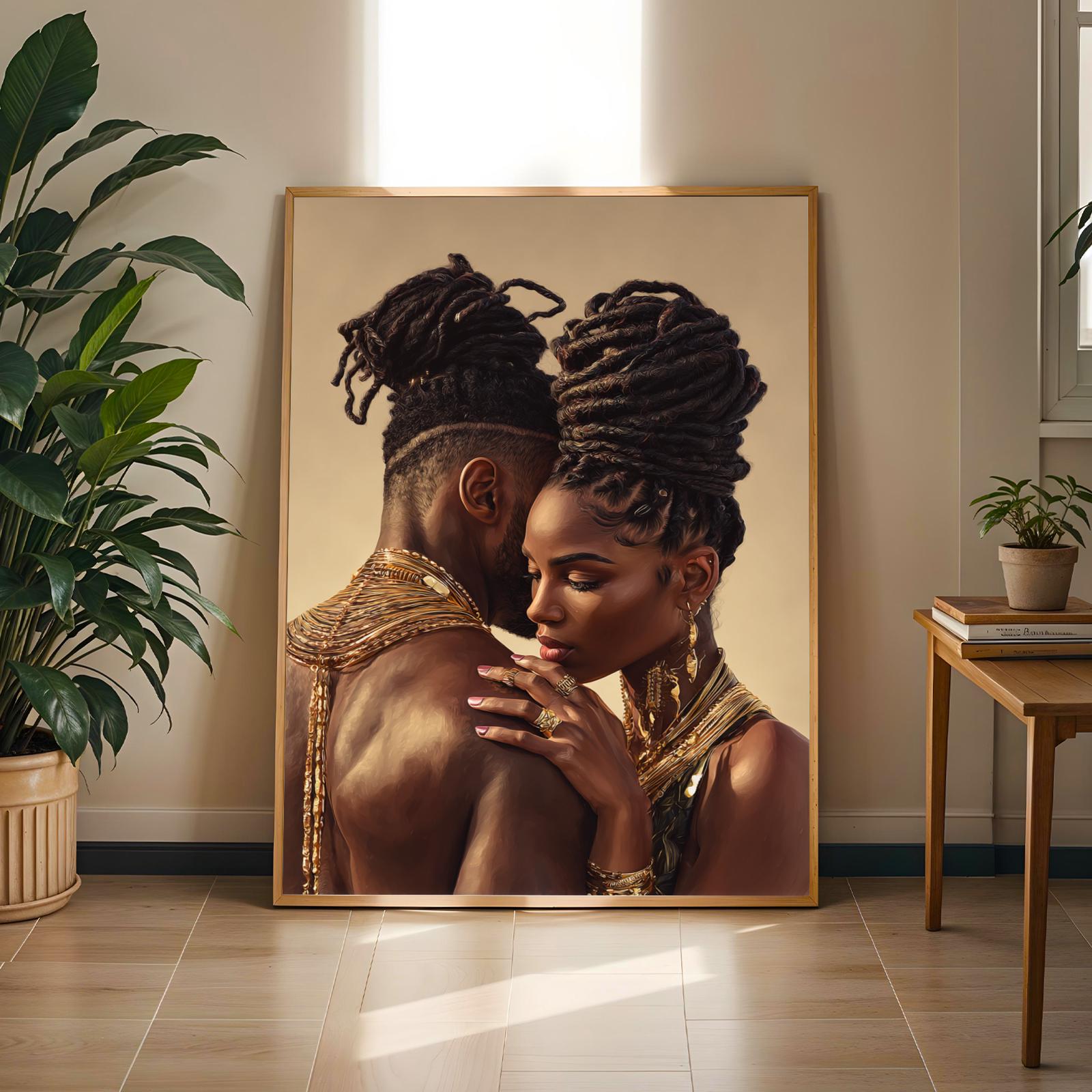 This captivating art print portrays an intimate moment between two individuals adorned in elegant gold jewelry, their intricate hairstyles and serene expressions captured in a rich, warm palette. The piece exudes a sense of connection and elegance, making it a striking addition to any space.