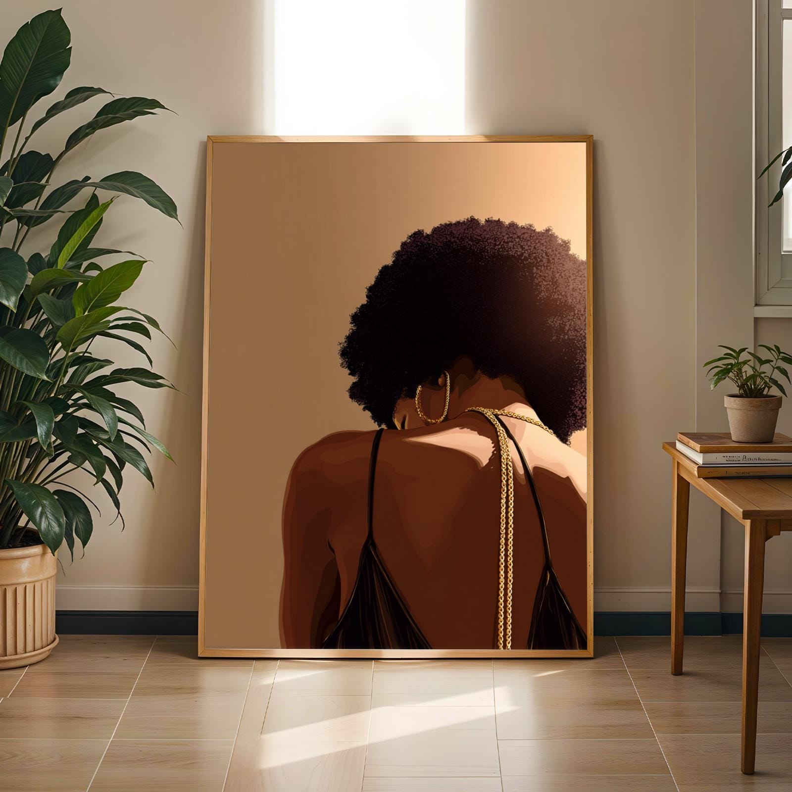 This striking art print captures the elegant silhouette of a woman with intricate jewelry draping down her back, set against a warm, minimalist background. The piece exudes a sense of sophistication and quiet strength, with its rich, earthy tones and delicate play of light.