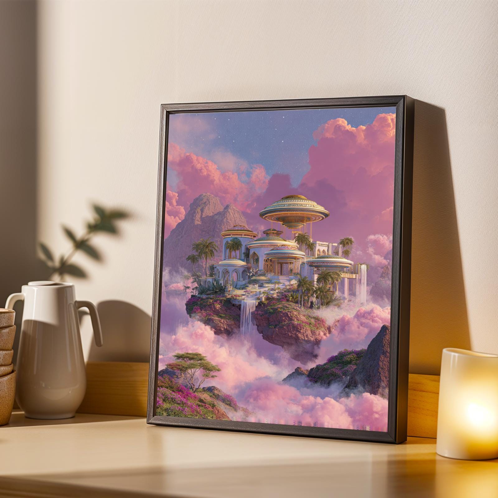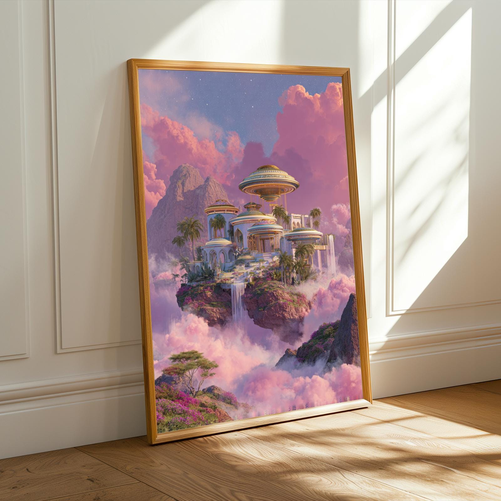 Step into a dreamlike realm with this enchanting art print, featuring a majestic, floating palace nestled among pink-hued clouds and vibrant foliage. The intricate architecture and serene waterfalls create a surreal and otherworldly atmosphere, perfect for adding a touch of fantasy to any space.