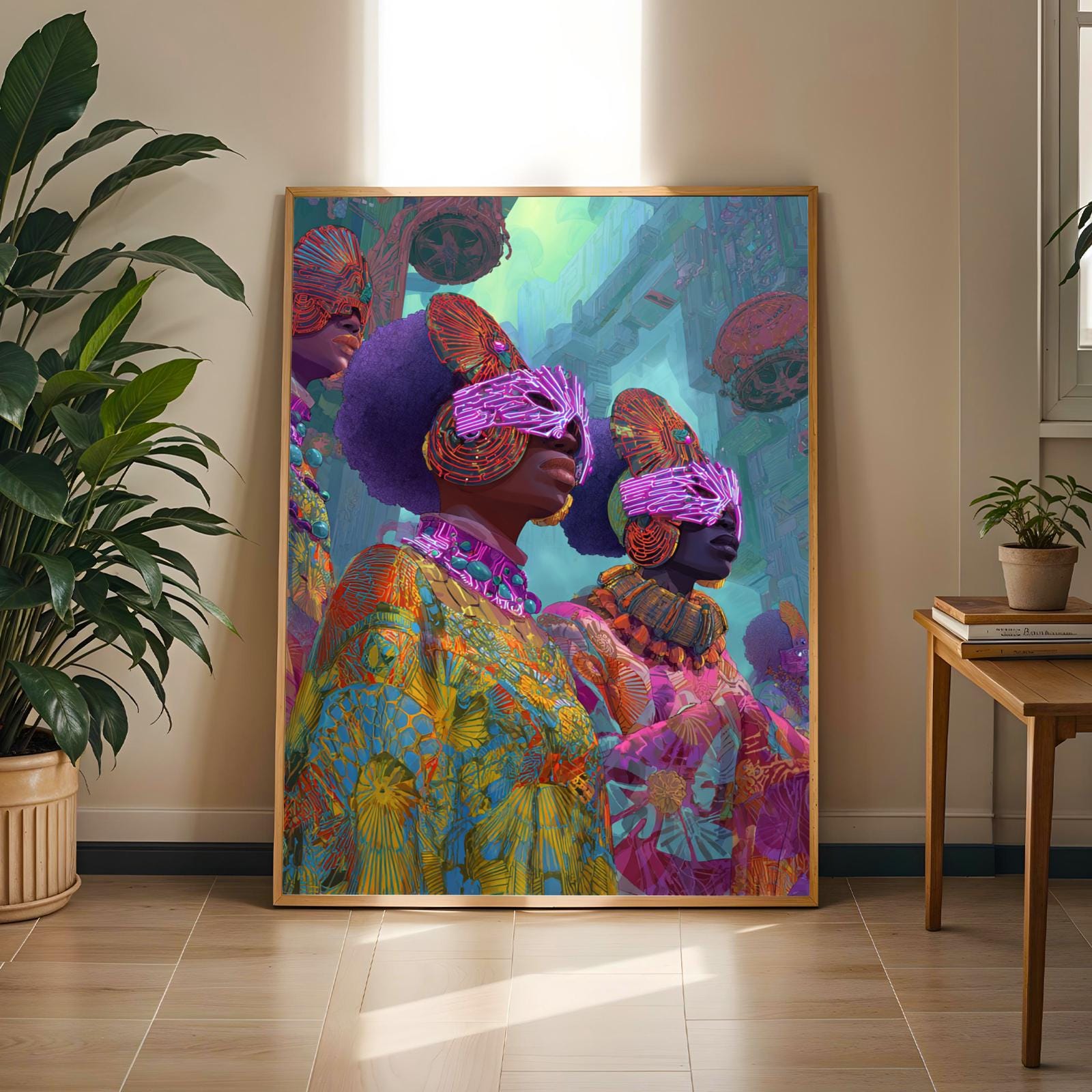 Immerse yourself in a vibrant, futuristic world with this striking art print, featuring three figures adorned in colorful, intricate patterns and neon-lit headpieces. The bold, surreal style and rich textures create a captivating vision of otherworldly elegance and cultural fusion.