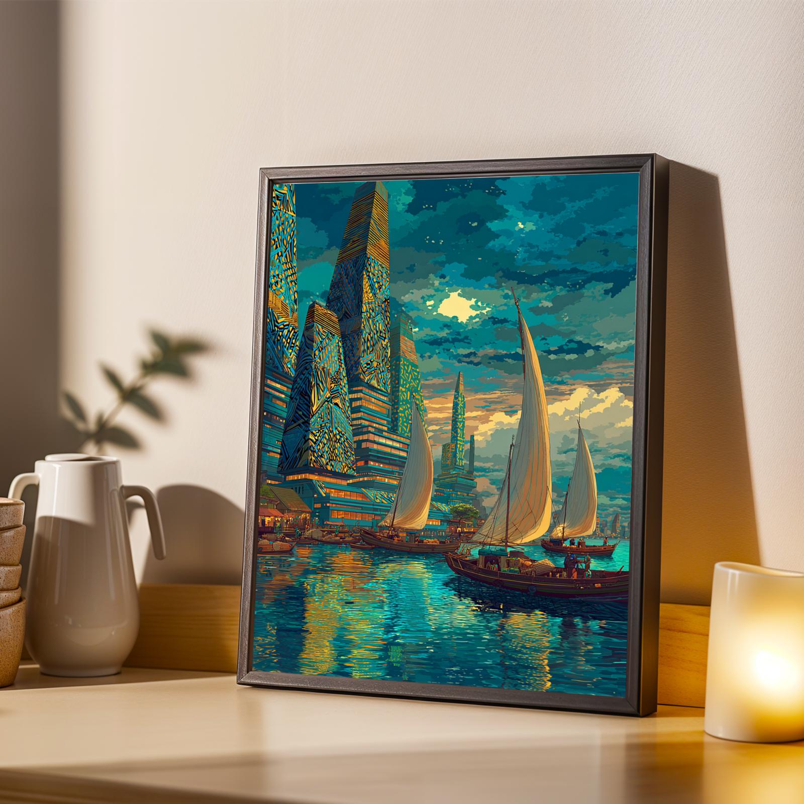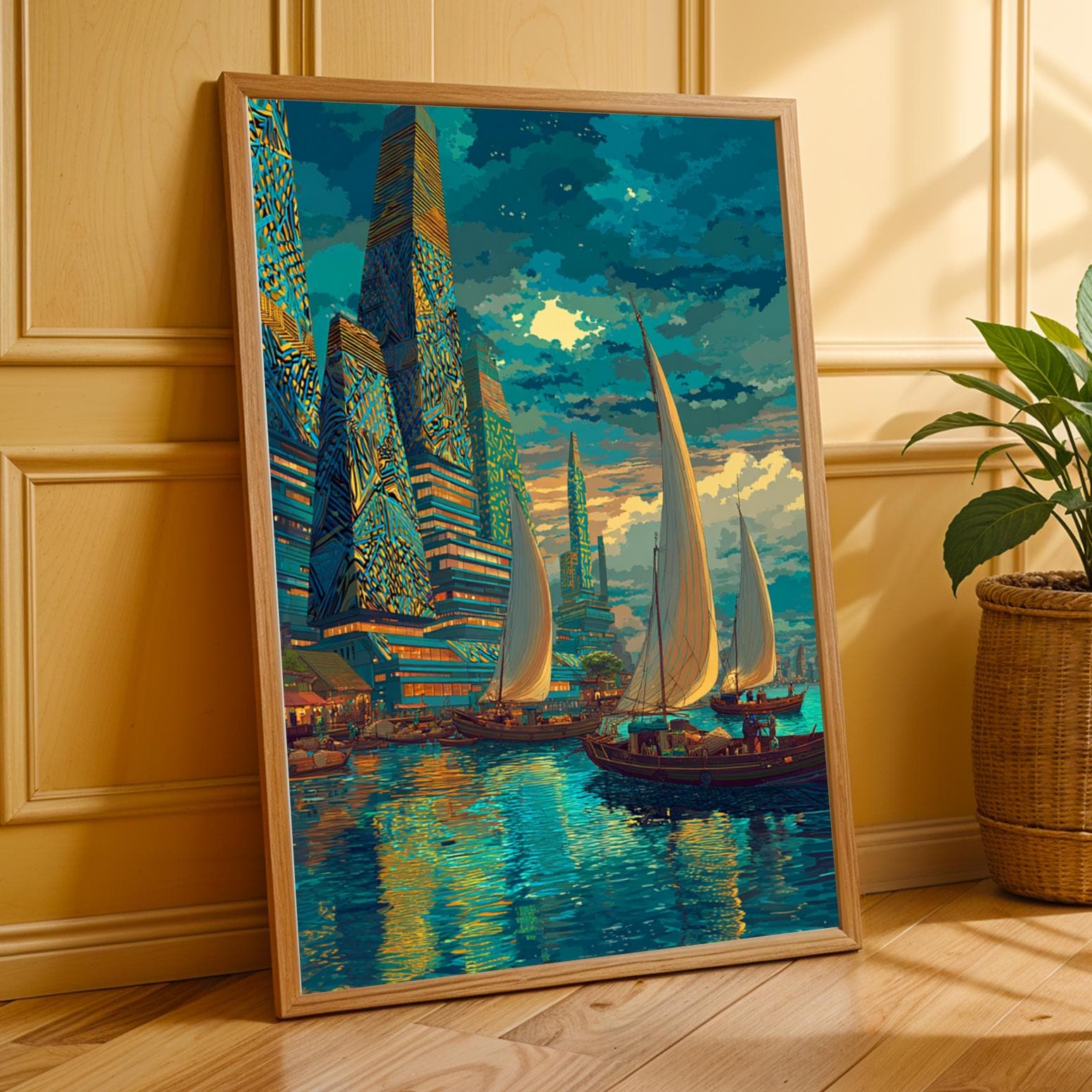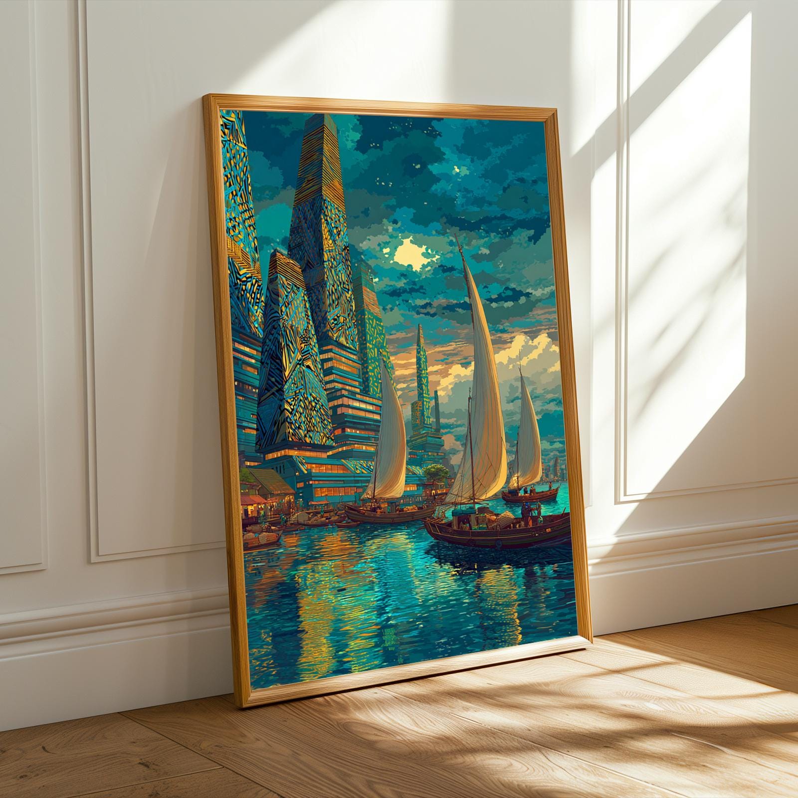 Immerse yourself in a futuristic harbor scene where vibrant, geometric skyscrapers tower over serene sailboats gliding across reflective waters. This captivating art print blends intricate architectural details with a tranquil maritime atmosphere, evoking a sense of wonder and adventure.
