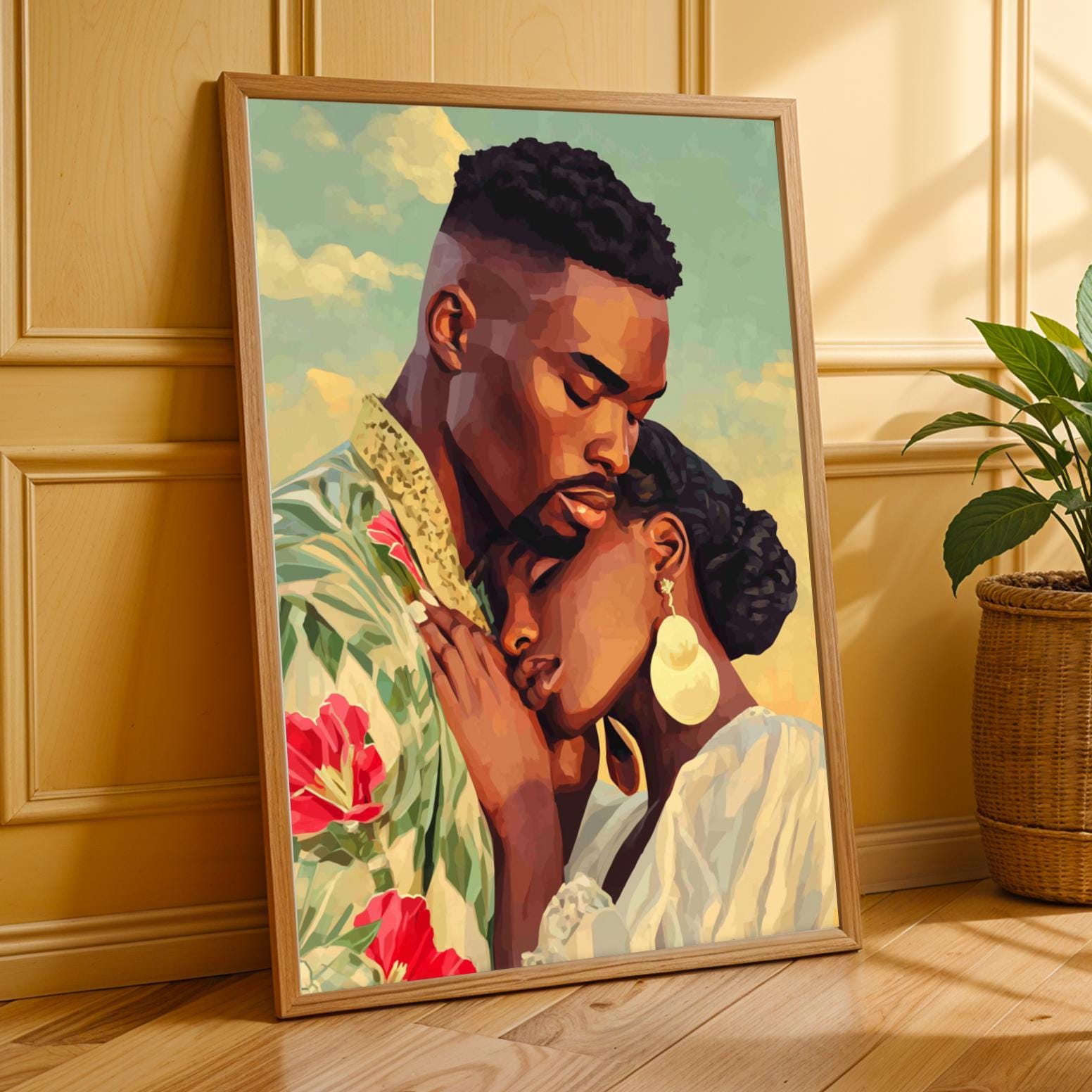 This captivating art print portrays an intimate embrace between a couple, rendered in a vibrant, geometric style that emphasizes the warmth and connection between them. The soft, pastel background and intricate detailing of floral patterns create a harmonious blend of romance and tranquility.