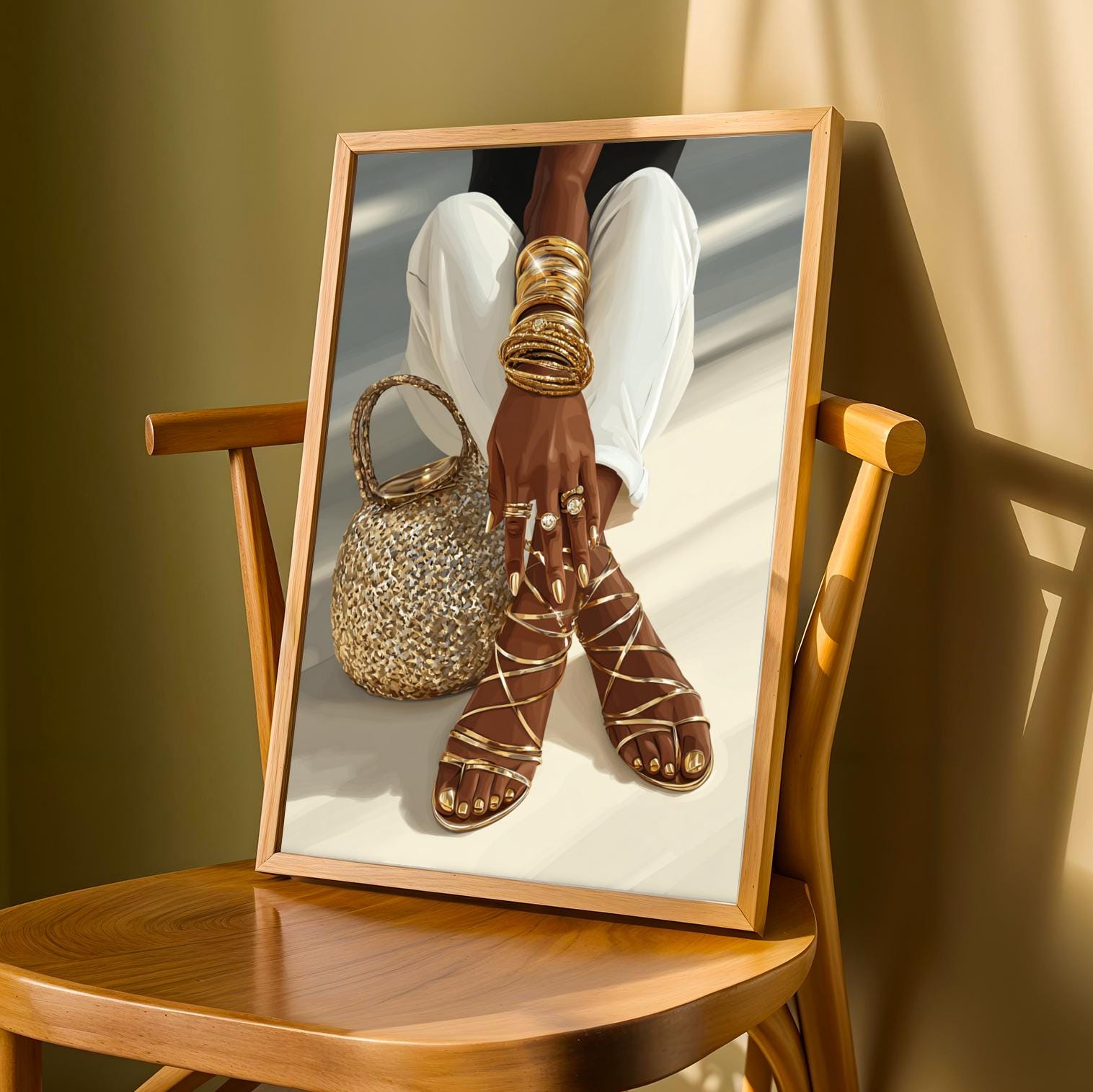 This captivating art print exudes elegance, featuring a stylish composition of gold accessories against a backdrop of white fabric, capturing the essence of modern sophistication. The intricate details of the metallic bangles, rings, and strappy sandals create a luxurious and chic aesthetic.