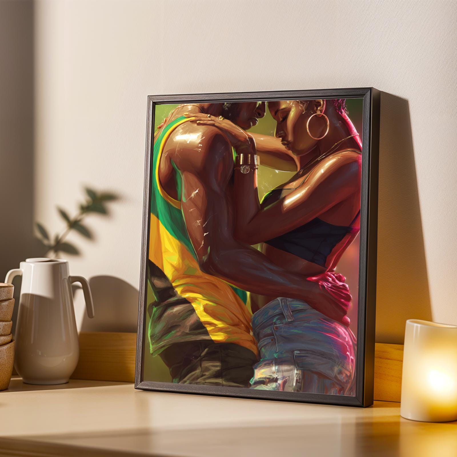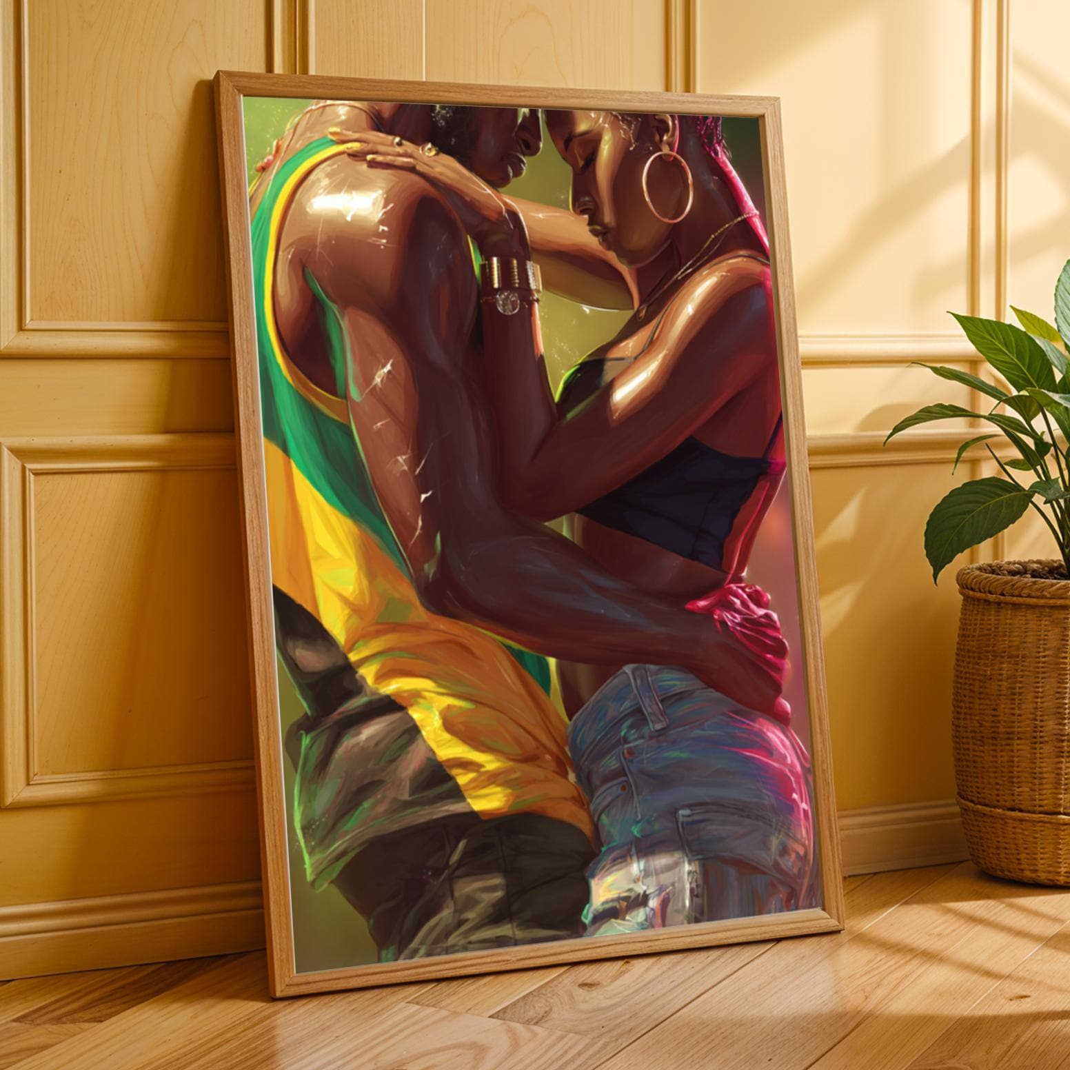 This captivating art print captures an intimate moment between two individuals, rendered in a vibrant, hyper-realistic style that highlights the warmth and connection between them. The rich play of light and color evokes a sense of passion and unity, making it a striking addition to any art collection.