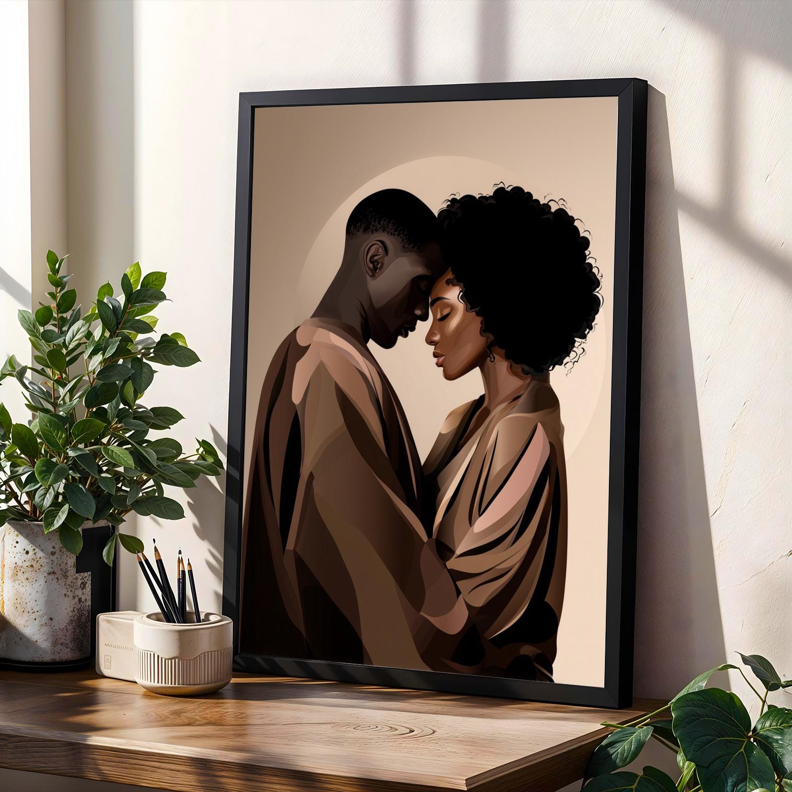 This captivating art print portrays an intimate moment between two figures, their foreheads gently touching in a tender embrace. The piece features a modern illustration style with smooth gradients and warm earth tones, evoking a sense of deep connection and serenity.