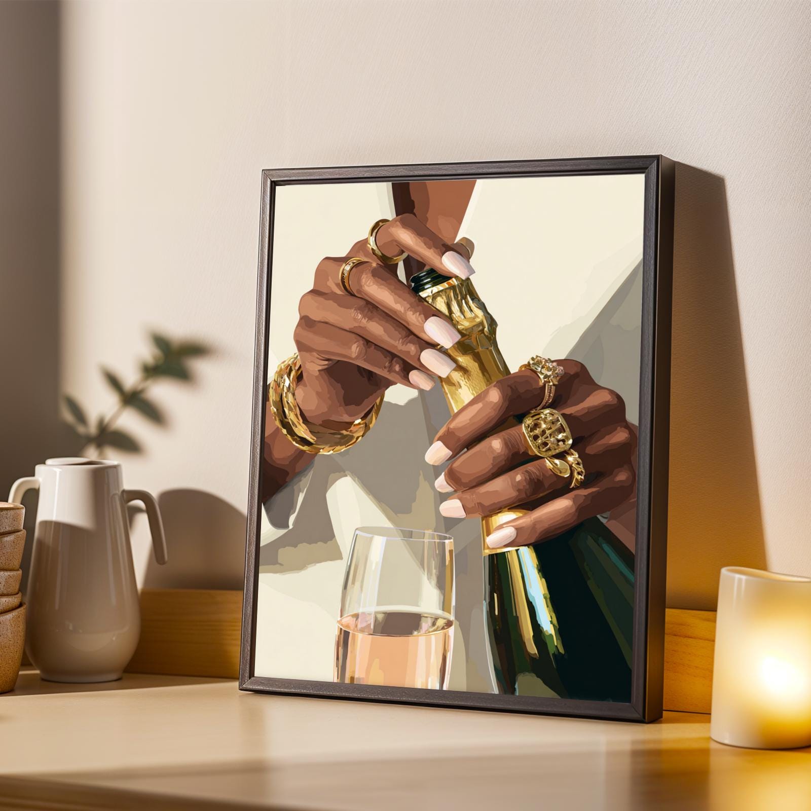Bring a touch of luxury and empowerment into your space with this stunning art print. Featuring the elegant hands of a Black woman adorned with gold rings and bangles as she opens a champagne bottle, this piece captures celebration, success, and self-care in bold detail. Perfect for anyone who loves a statement artwork that exudes sophistication and power.