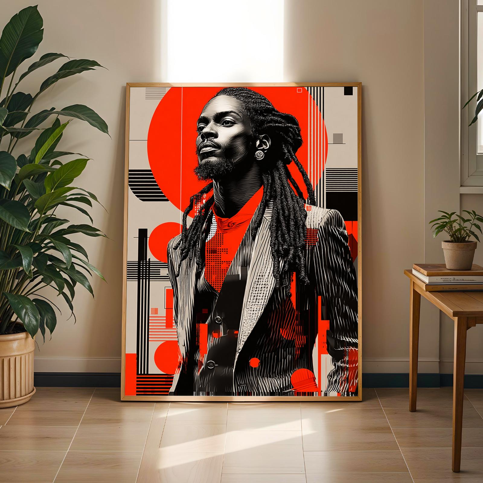 This striking art print captures a confident individual in a dynamic blend of black, white, and bold red tones, set against a modern geometric background. The intricate detailing and vibrant contrasts create an empowering and contemporary piece that commands attention.