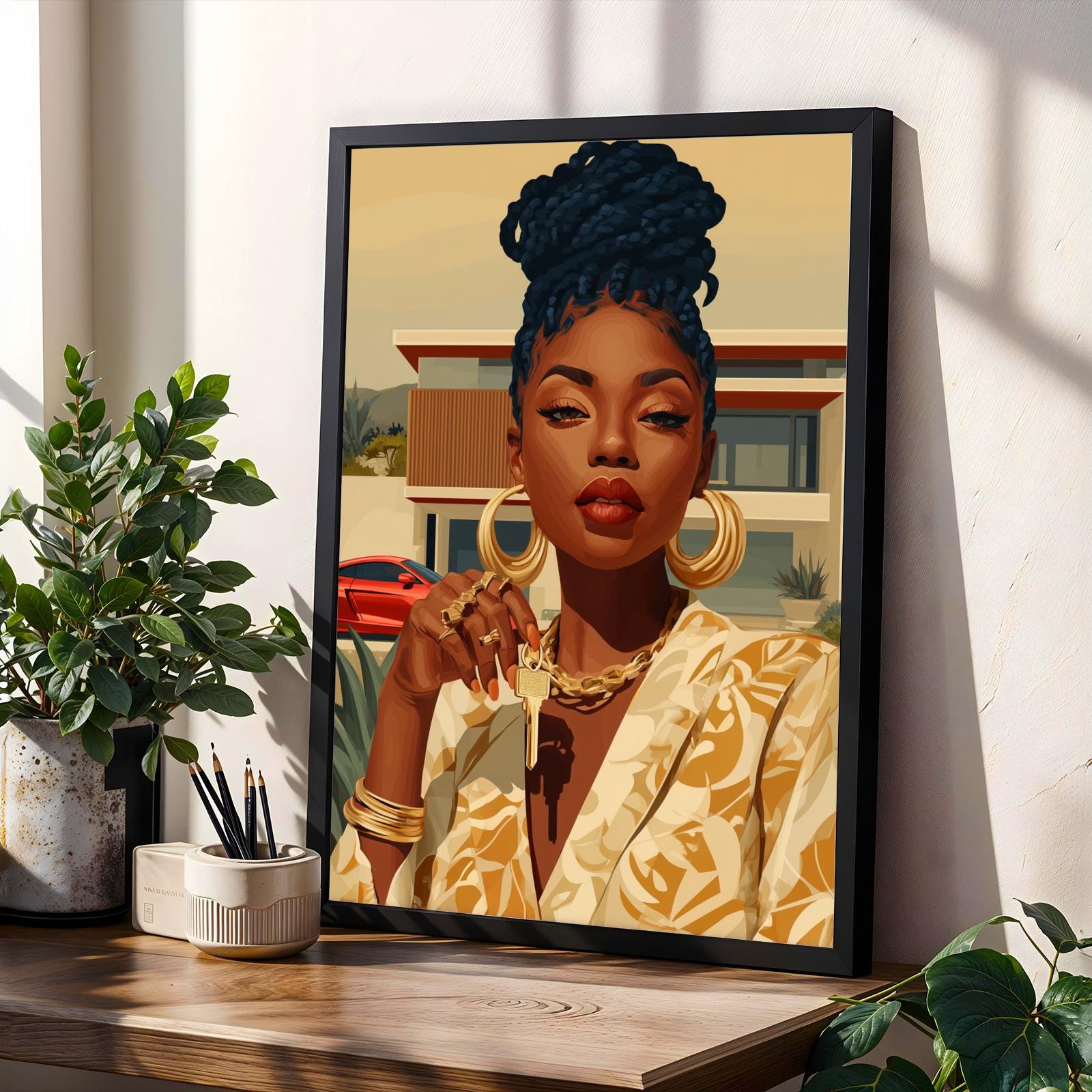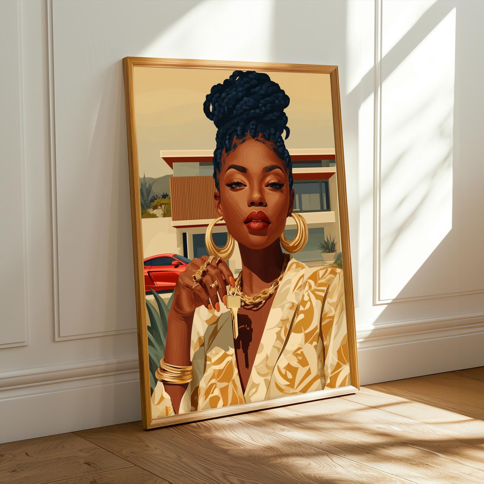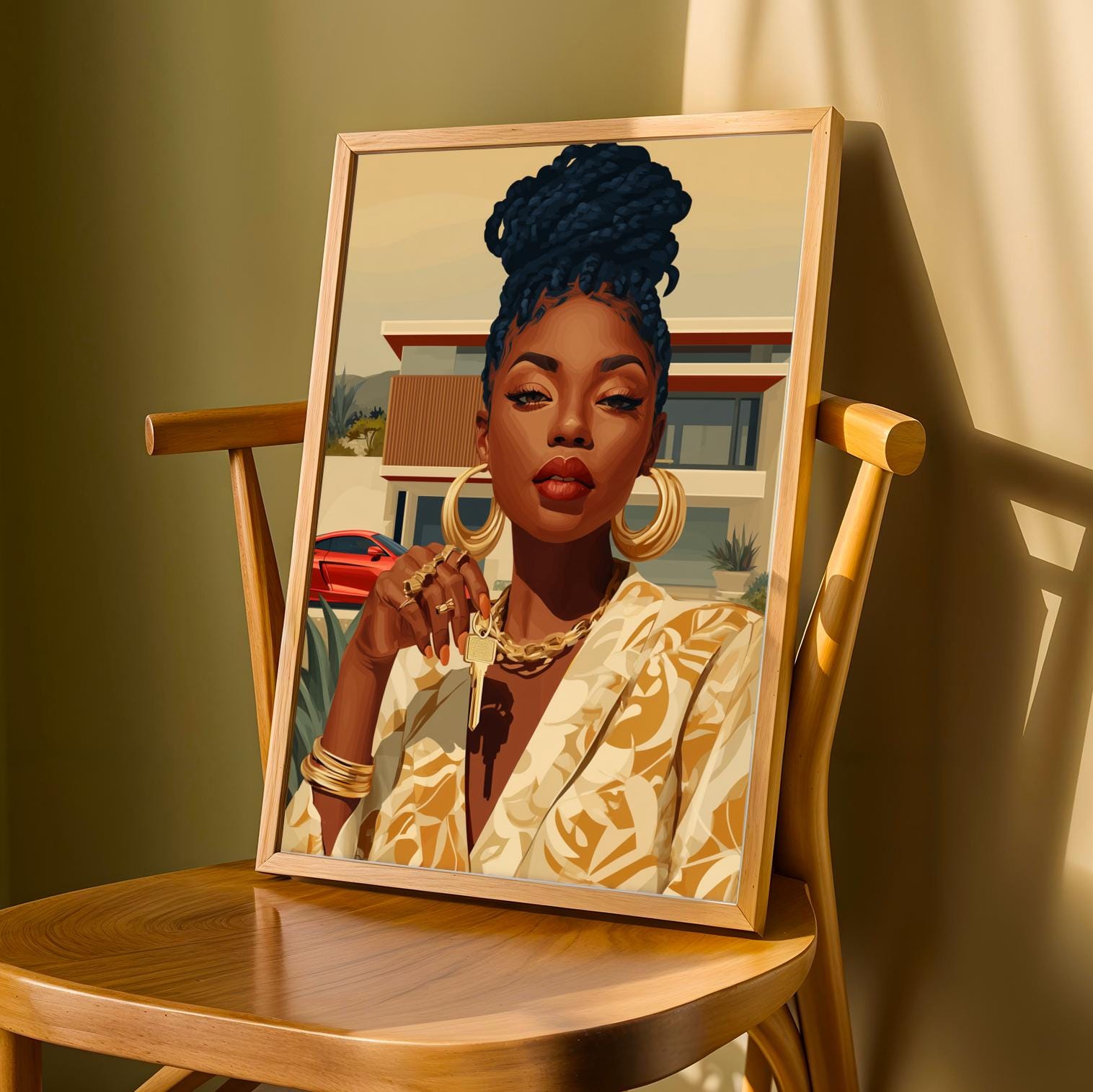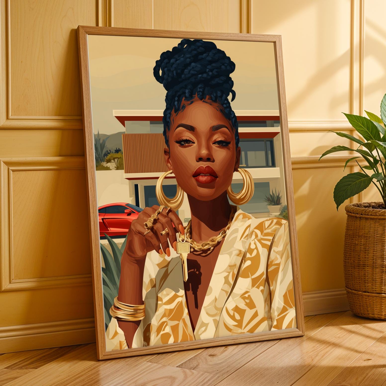 This striking art print captures a confident woman adorned in luxurious gold jewelry and a patterned blazer, set against a sleek modern house and a vibrant red sports car. The bold, stylized illustration exudes an air of elegance and empowerment, making it a captivating centerpiece for any space.