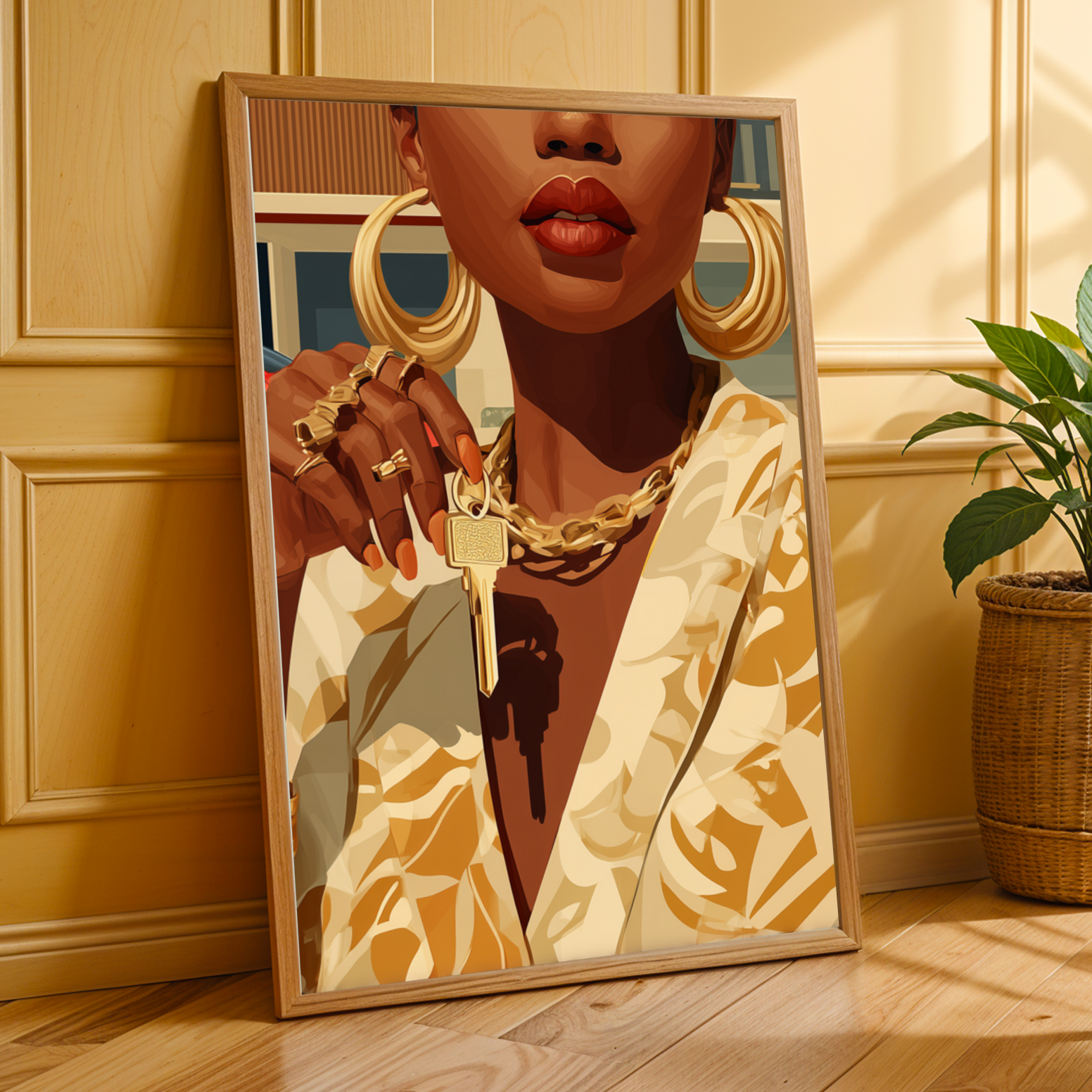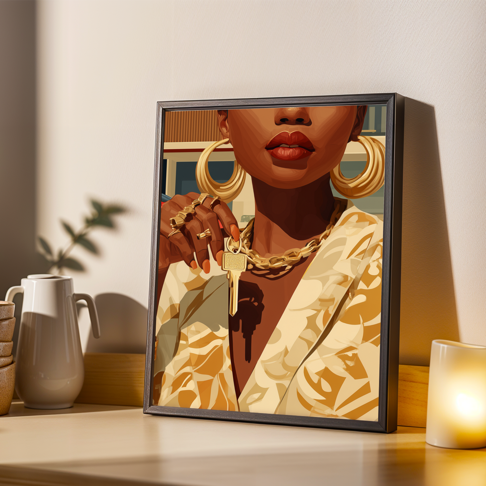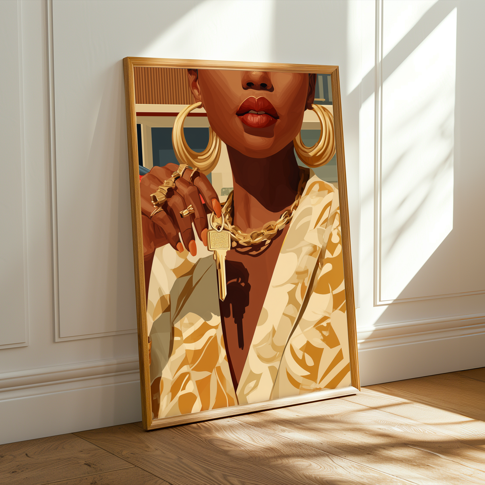 This striking art print captures a confident woman adorned in luxurious gold jewelry and a patterned blazer, set against a sleek modern house and a vibrant red sports car. The bold, stylized illustration exudes an air of elegance and empowerment, making it a captivating centerpiece for any space.