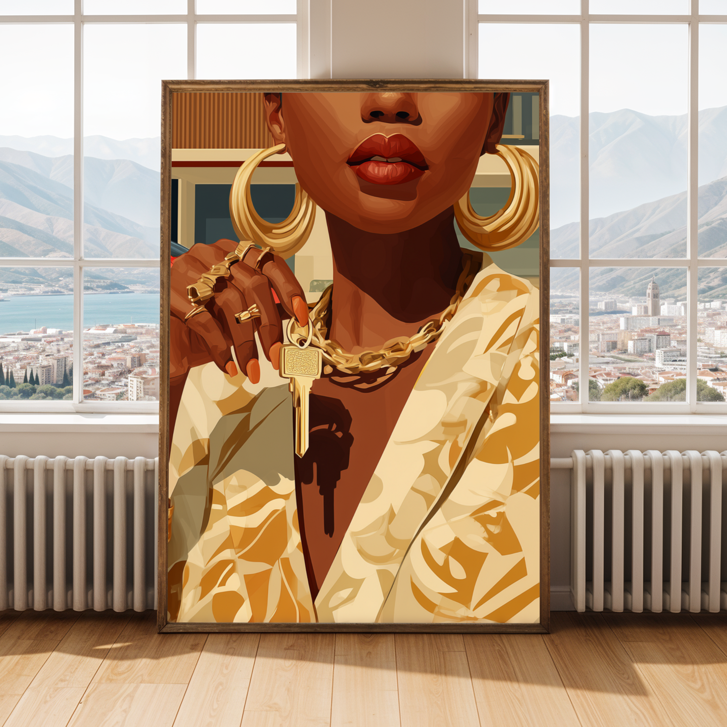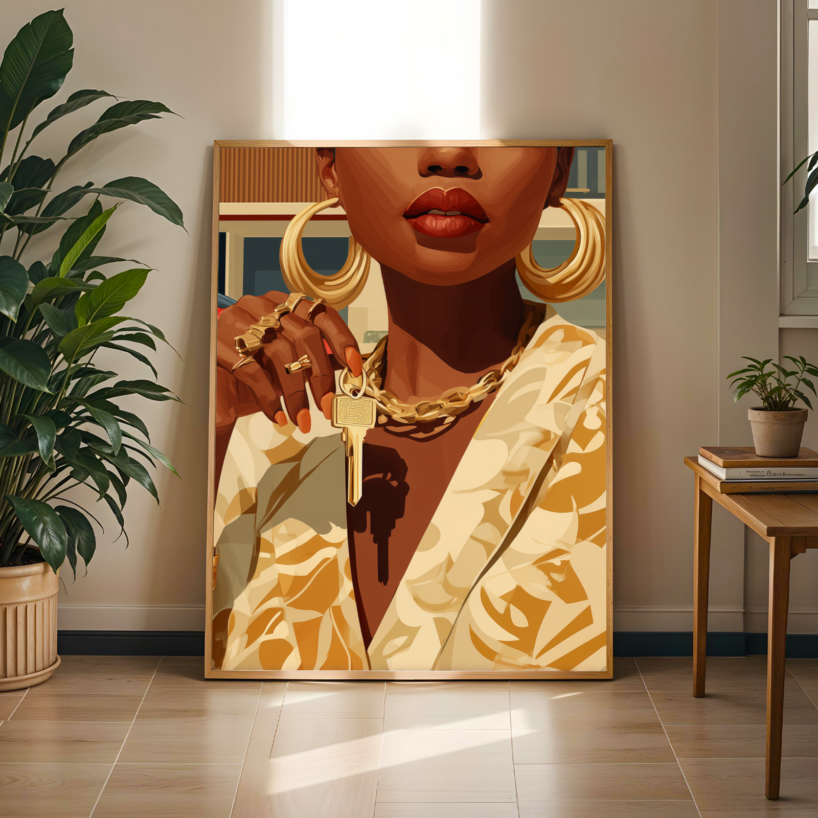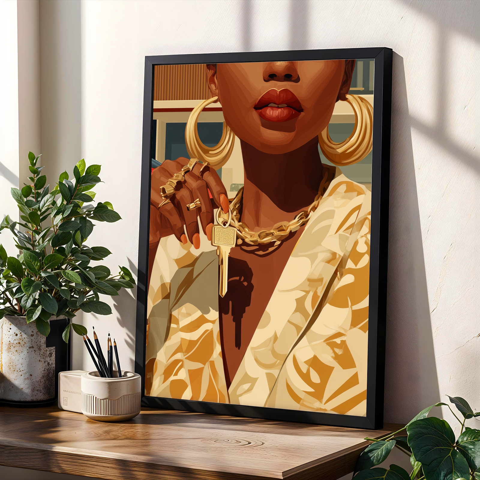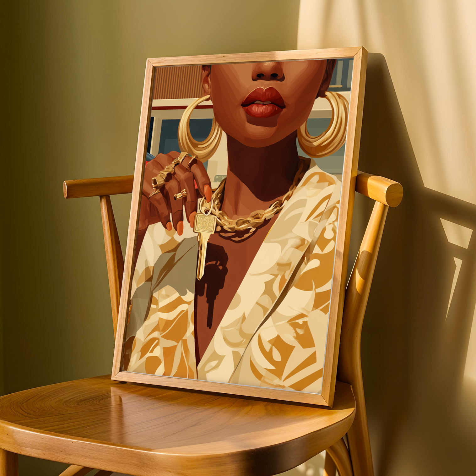 This striking art print captures a confident woman adorned in luxurious gold jewelry and a patterned blazer, set against a sleek modern house and a vibrant red sports car. The bold, stylized illustration exudes an air of elegance and empowerment, making it a captivating centerpiece for any space.