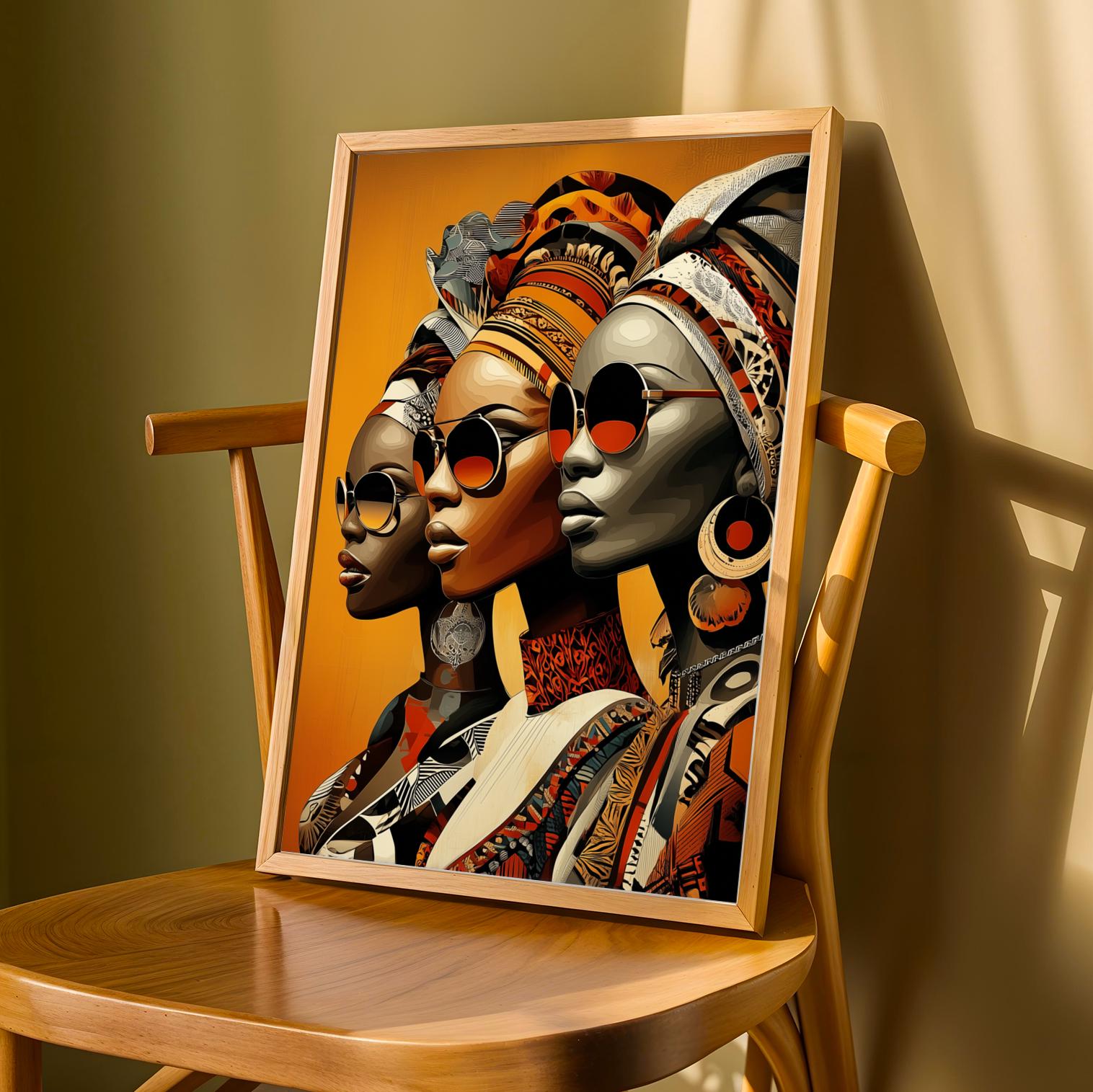 This striking art print features three women adorned in vibrant, patterned headwraps and sunglasses, exuding a bold and confident aura against a warm, orange backdrop. The piece captures a modern and stylish aesthetic with its dynamic use of color and intricate detailing, making it a captivating addition to any space.