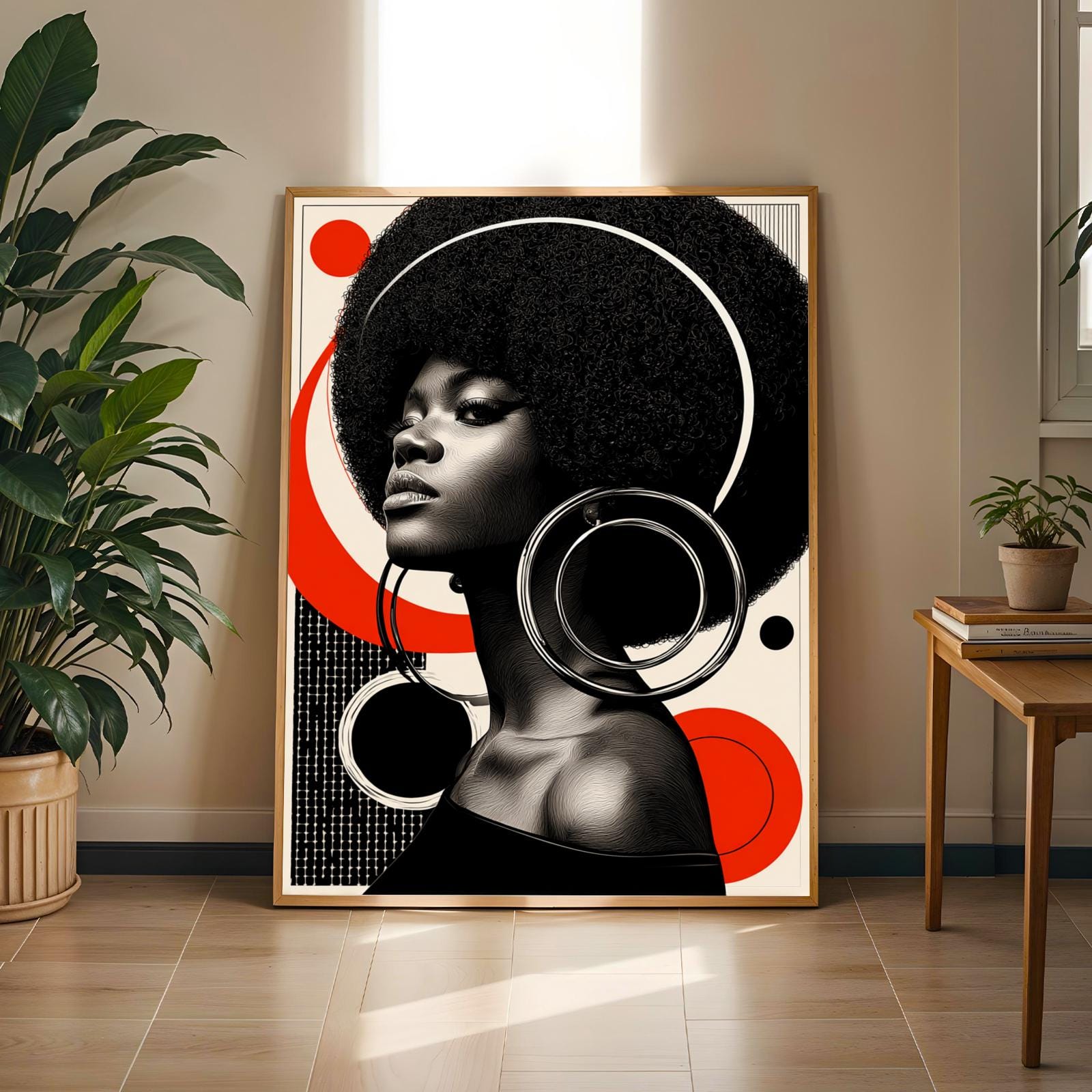 This striking art print features a powerful portrait of a woman with a voluminous afro and bold hoop earrings, set against a backdrop of dynamic red and black geometric shapes. The intricate linework and contrast create a captivating blend of elegance and modernity, making it a standout piece for any art collection.