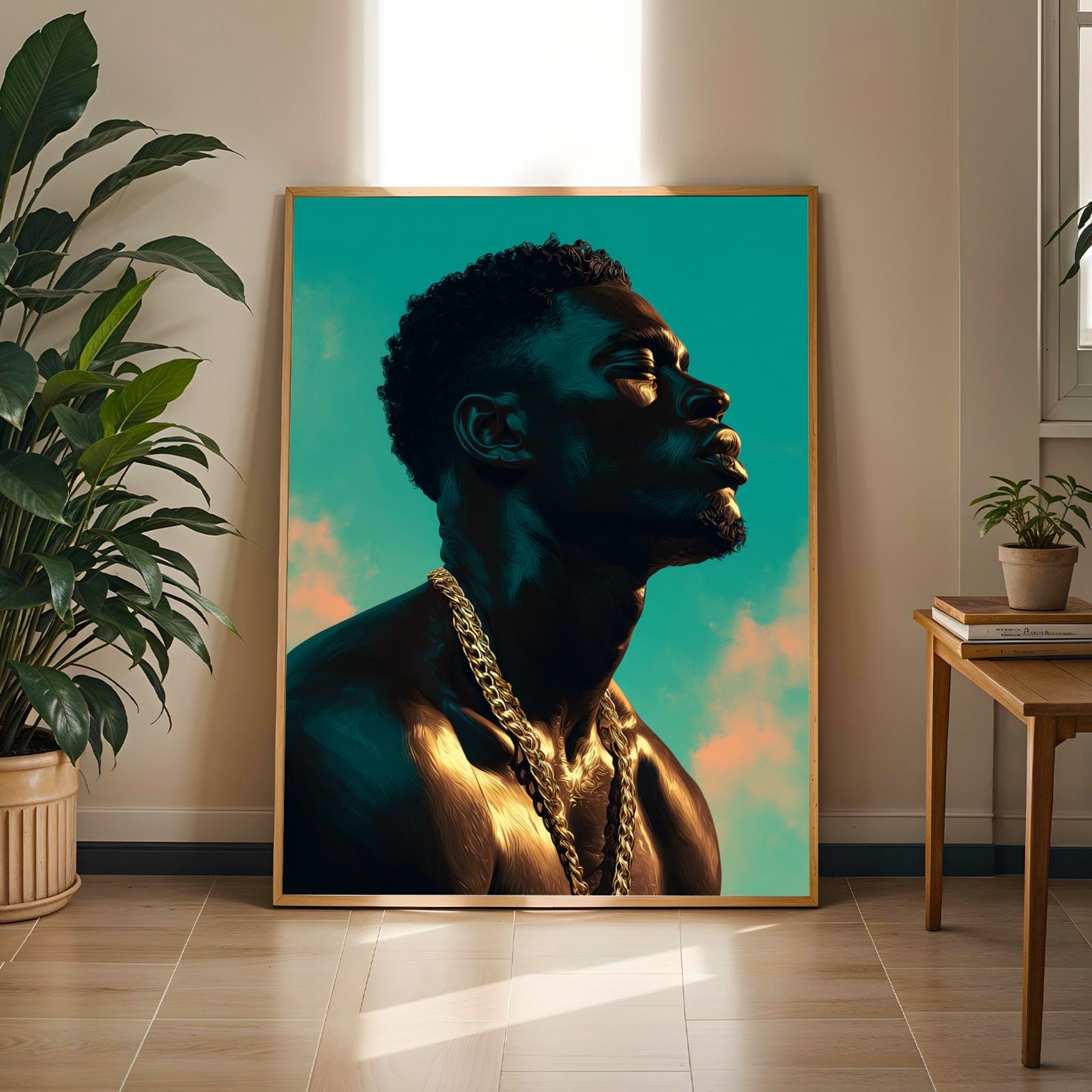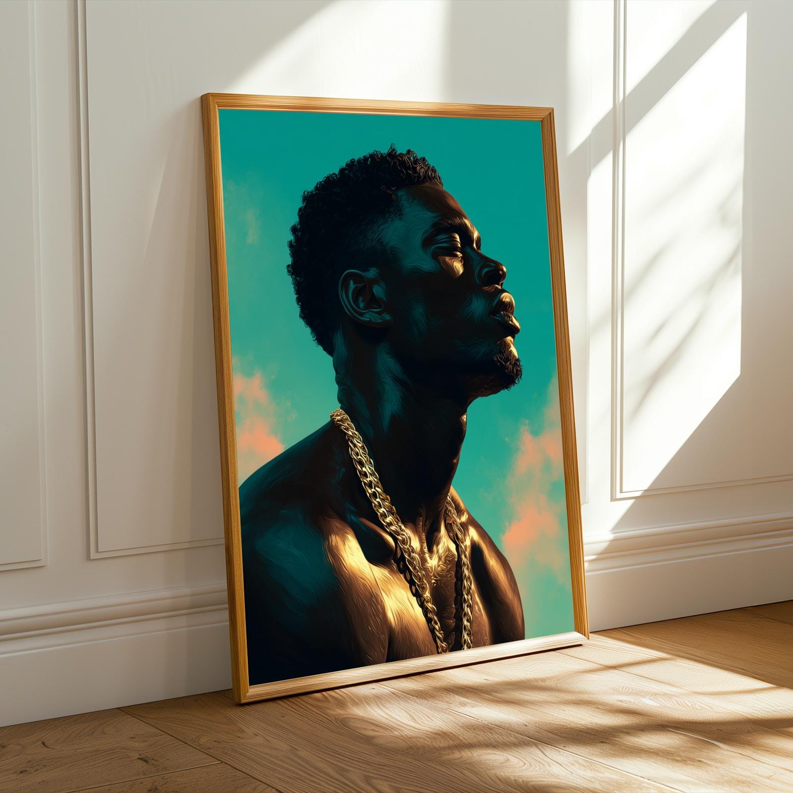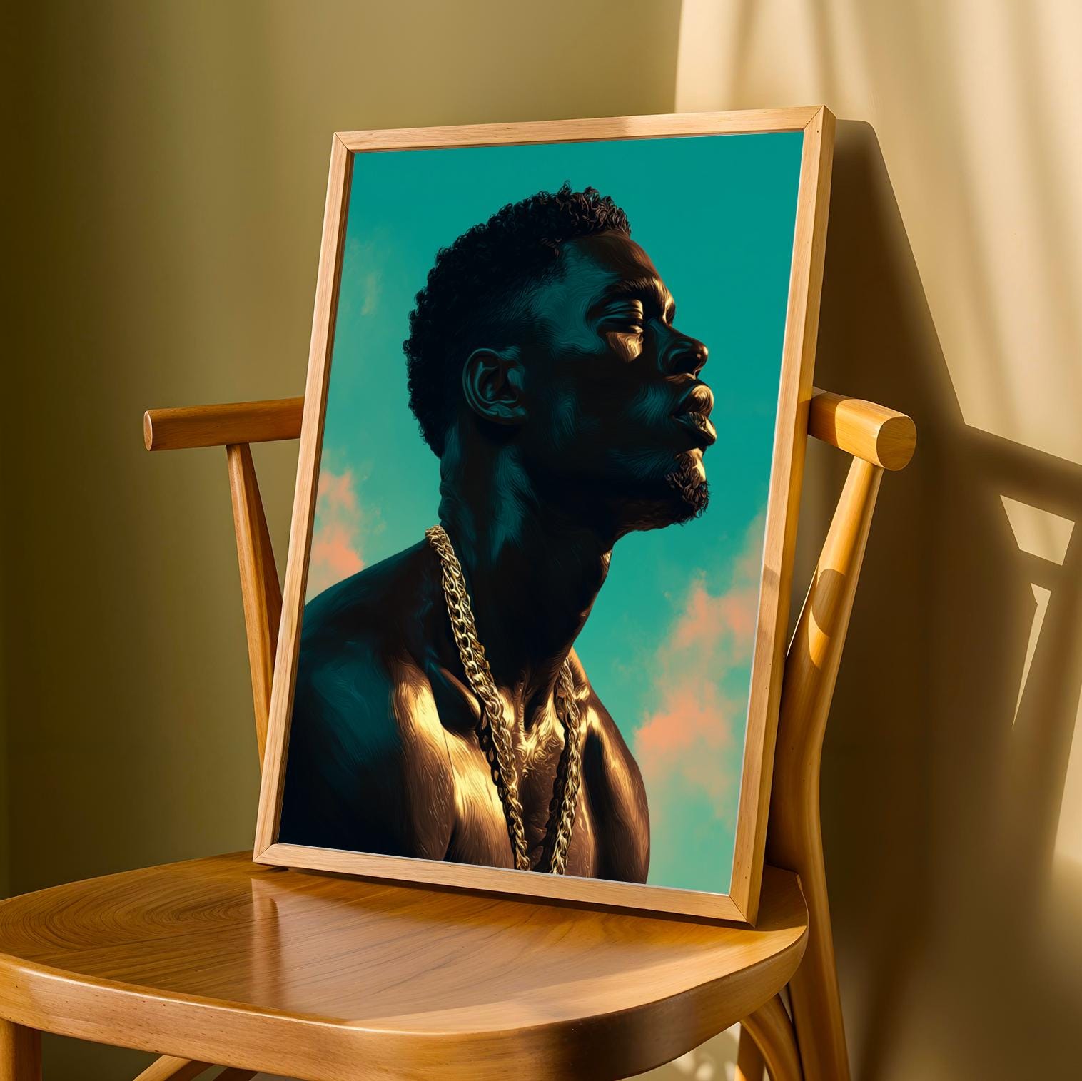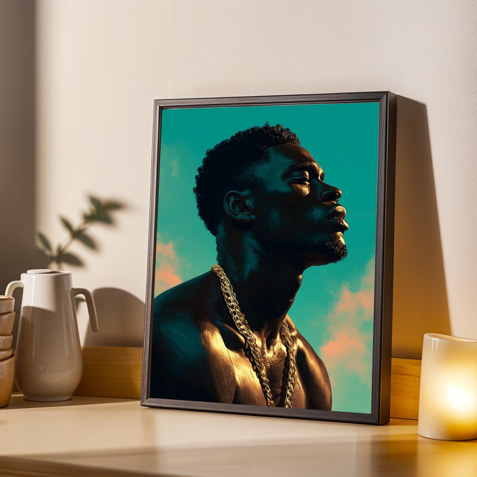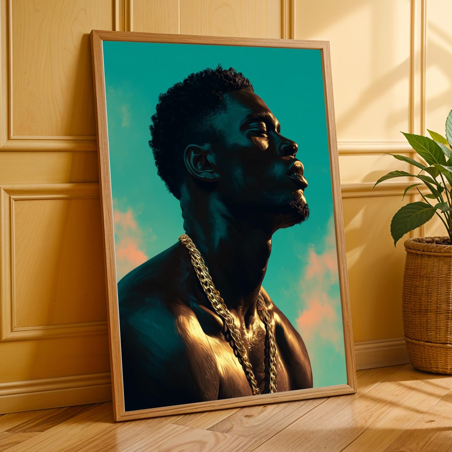 This striking art print captures the powerful profile of a man adorned with a gold chain, set against a vibrant turquoise sky. The dramatic lighting and rich textures create a bold and captivating portrait that exudes strength and elegance.