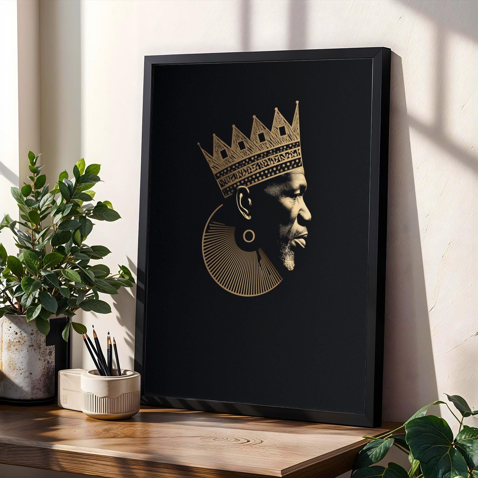This striking art print features a regal profile of a man adorned with an intricate golden crown, set against a deep black background. The minimalist design and elegant use of gold detailing evoke a sense of majesty and timeless grace.