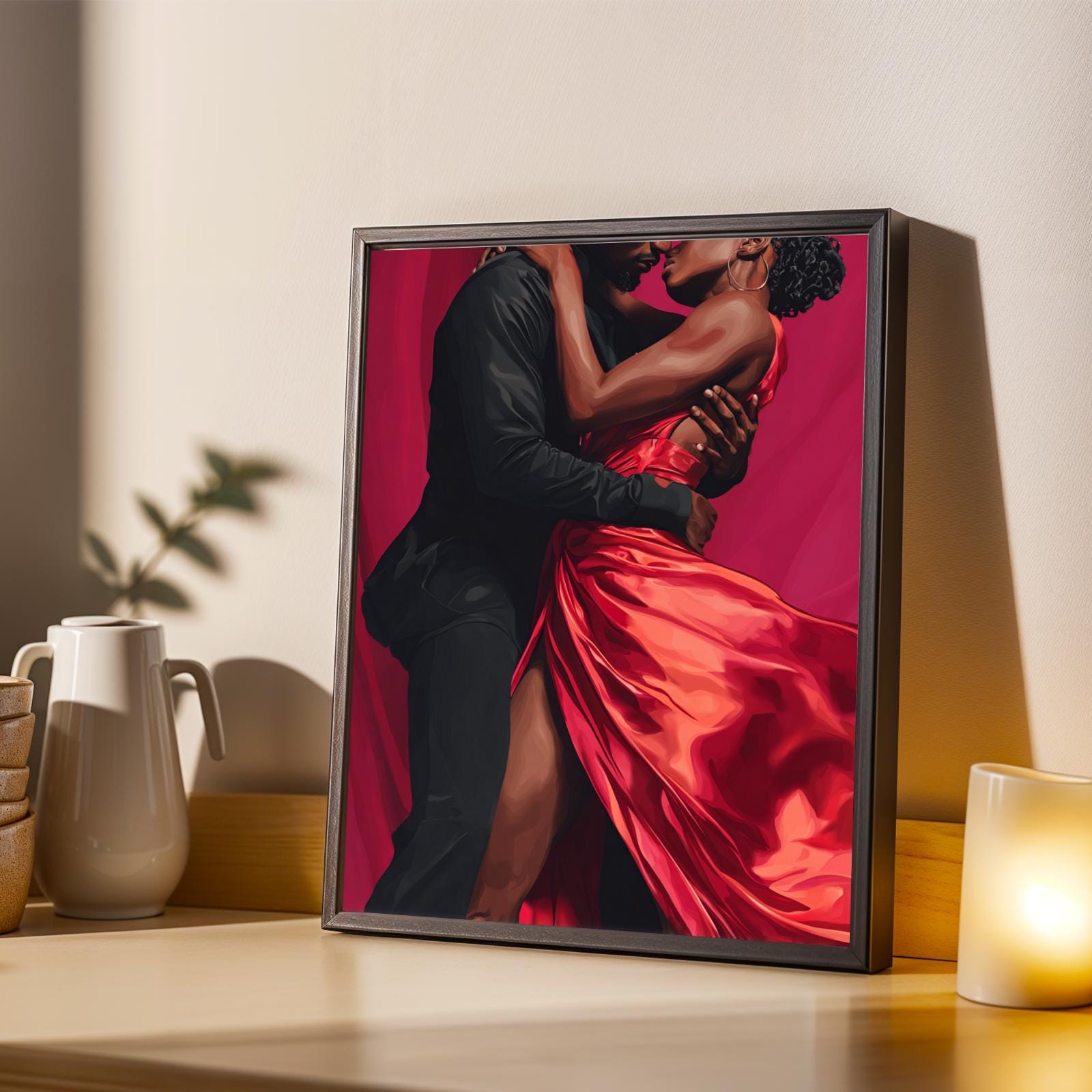 Each print features rich chocolate tones, luxurious silk textures, and deep emotional connection from vintage record players draped in ruby hues, to lovers caught in a timeless dance.
