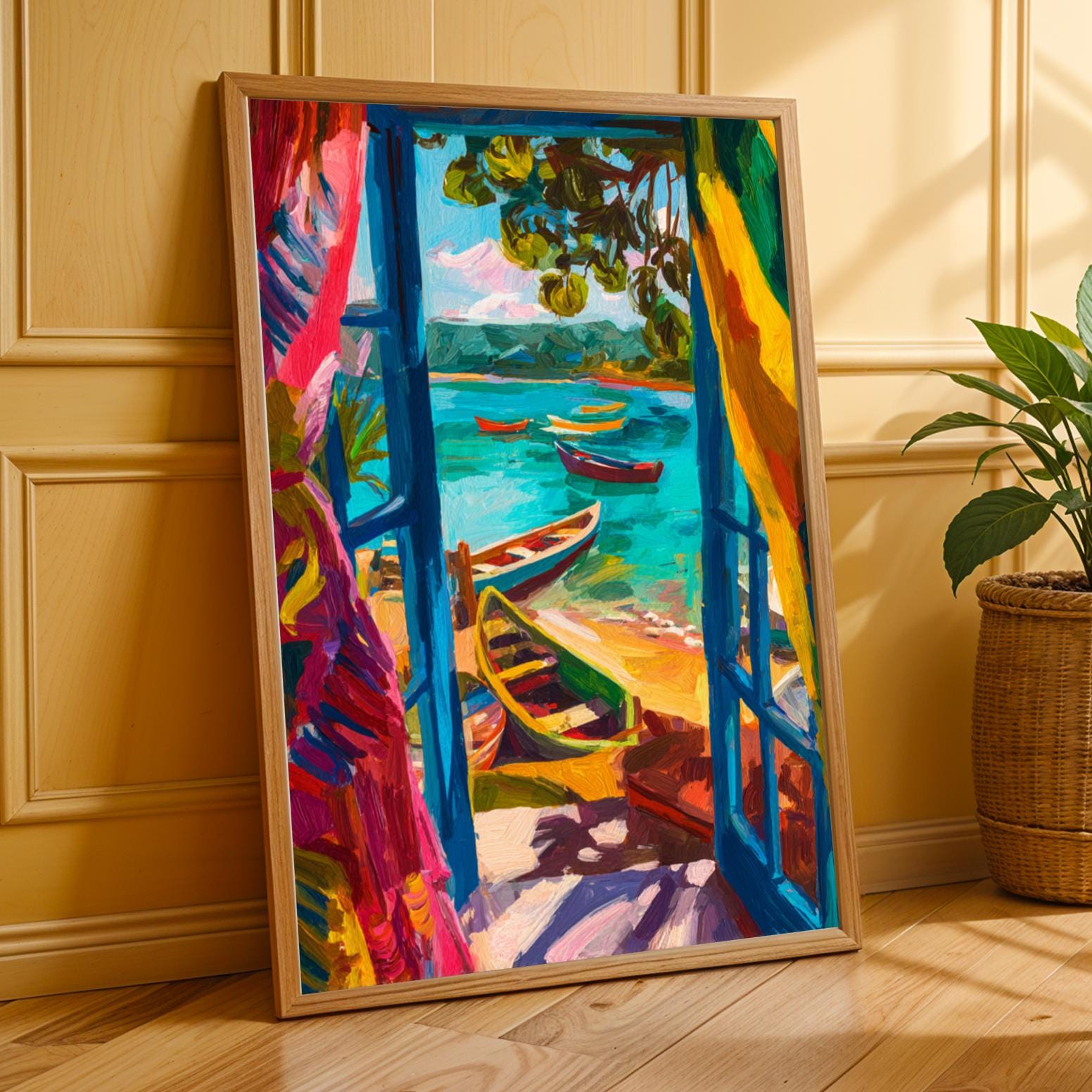 Step into a vibrant coastal paradise with this colorful impressionistic art print, featuring a sunlit view through an open window to a serene beach adorned with lively boats and lush foliage. The bold brushstrokes and vivid palette evoke a sense of warmth and adventure, perfect for bringing a touch of tropical escape to any space.