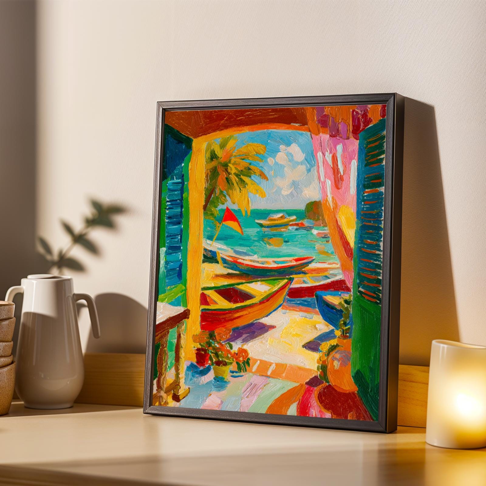 Immerse yourself in a vibrant coastal escape with this vivid art print, featuring colorful boats and lush palm trees framed by an inviting seaside veranda. The dynamic brushstrokes and bold palette evoke the warmth and joy of a sunlit tropical paradise.