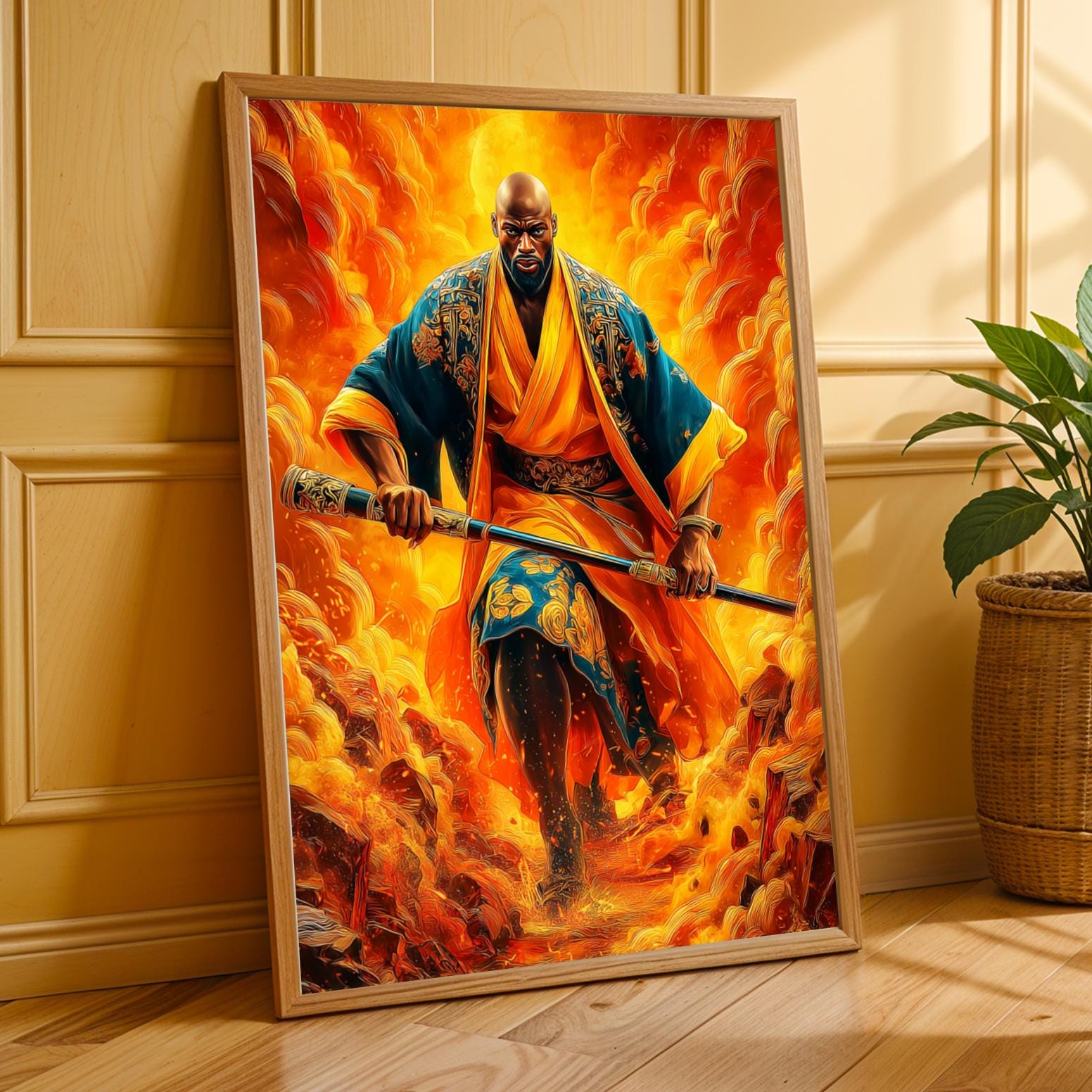 Immerse yourself in this dynamic art print featuring a powerful warrior striding through a fiery landscape, adorned in a richly detailed robe of deep blues and vibrant golds. The bold, swirling flames and intense expression create a sense of unstoppable determination and strength, making it a captivating centerpiece for any space.