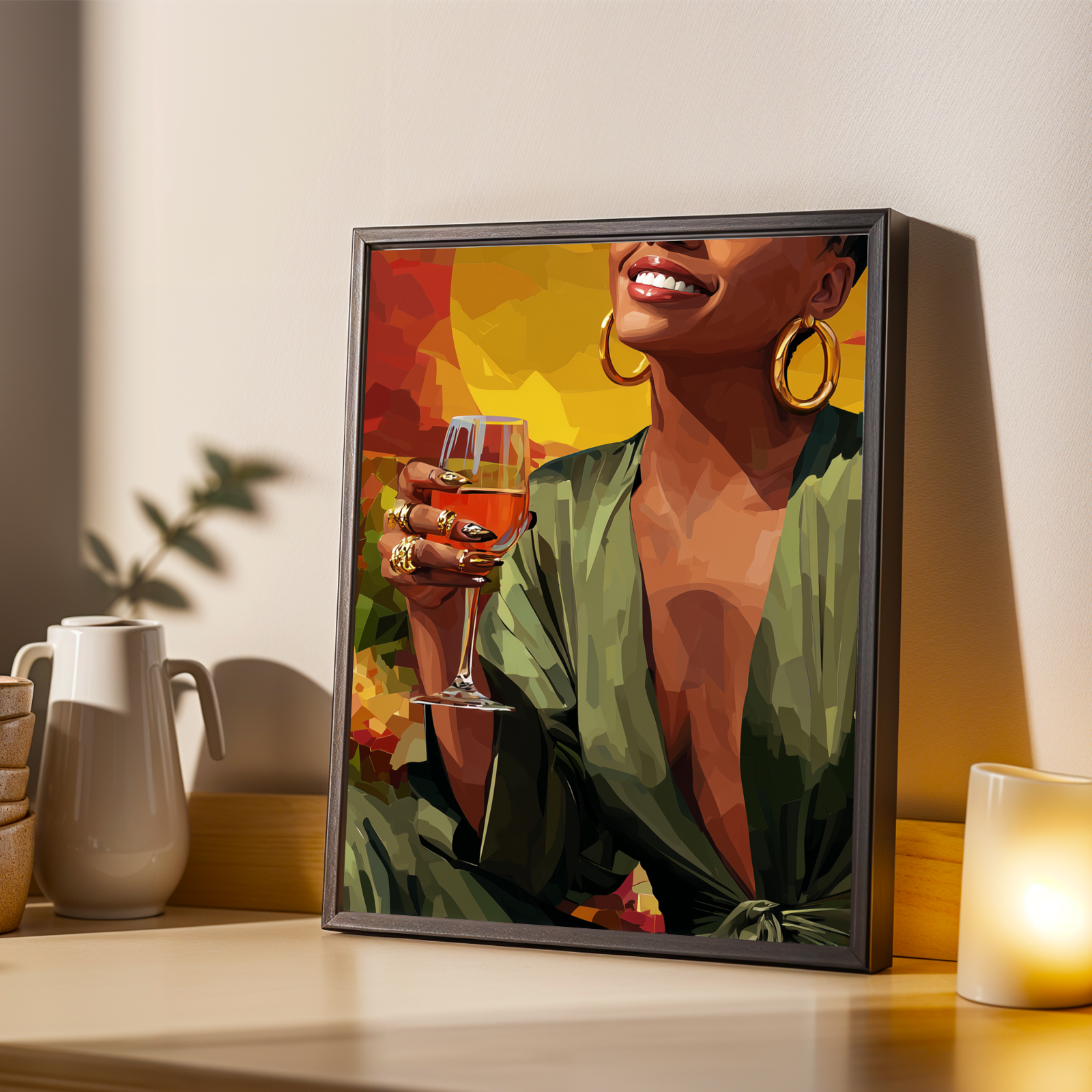 This vibrant art print captures the essence of joy and relaxation, featuring a woman with a radiant smile savoring a glass of wine against a warm, sunset-inspired backdrop. The bold geometric style and rich, earthy tones create a sense of warmth and celebration.