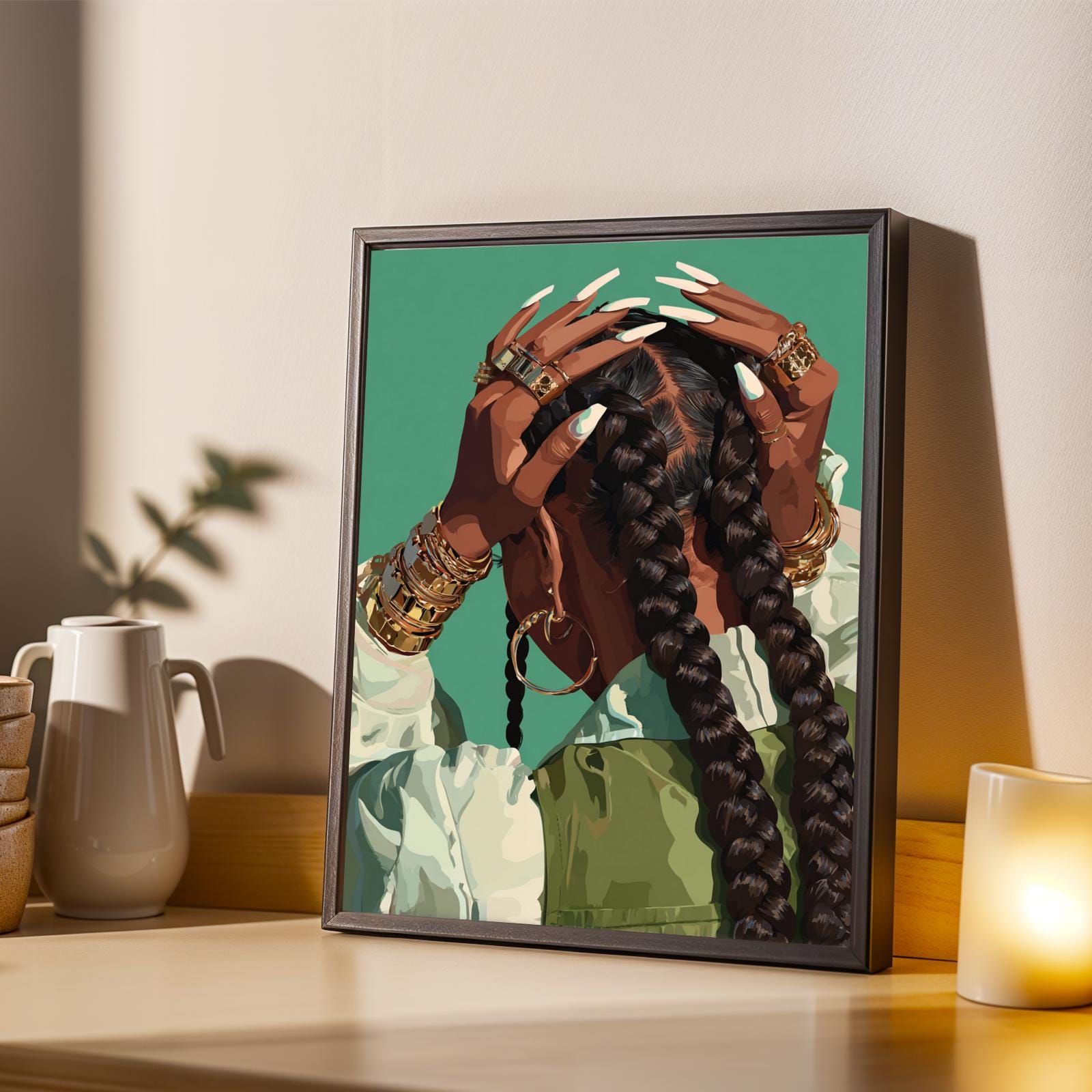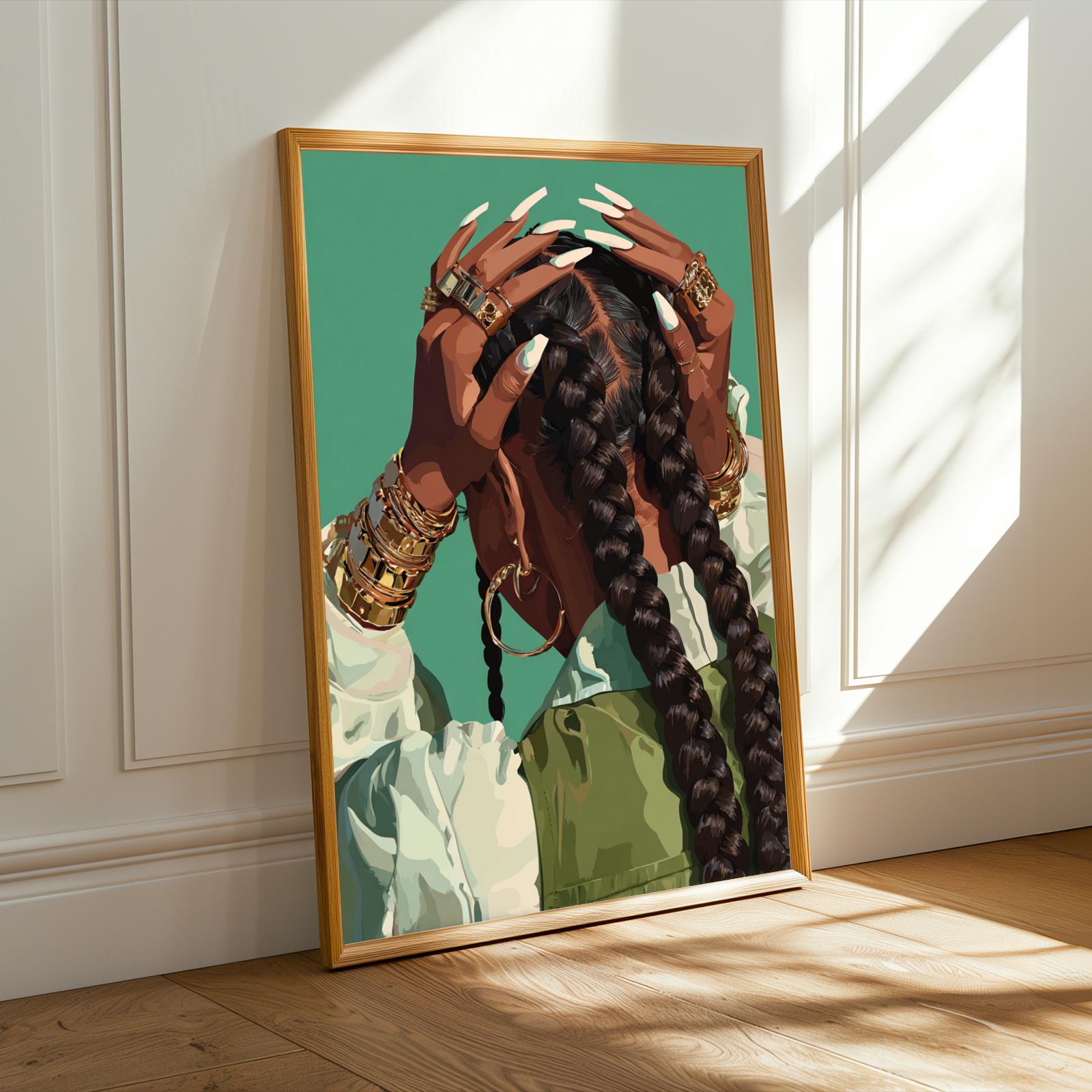 This striking art print captures a powerful moment of self-expression, featuring a figure adorned with bold, gold jewelry and long, intricately braided hair against a vibrant green background. The detailed portrayal of hands and accessories adds a touch of elegance and strength, making it a perfect statement piece for any modern decor.