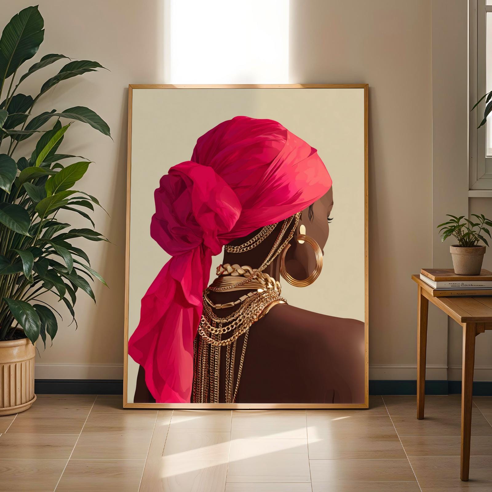 This striking art print captures the elegance of a woman adorned in vibrant gold jewelry and a bold red headscarf, exuding a sense of regal sophistication. The smooth, detailed illustration highlights the rich textures and colors, creating a captivating and empowering visual statement.
