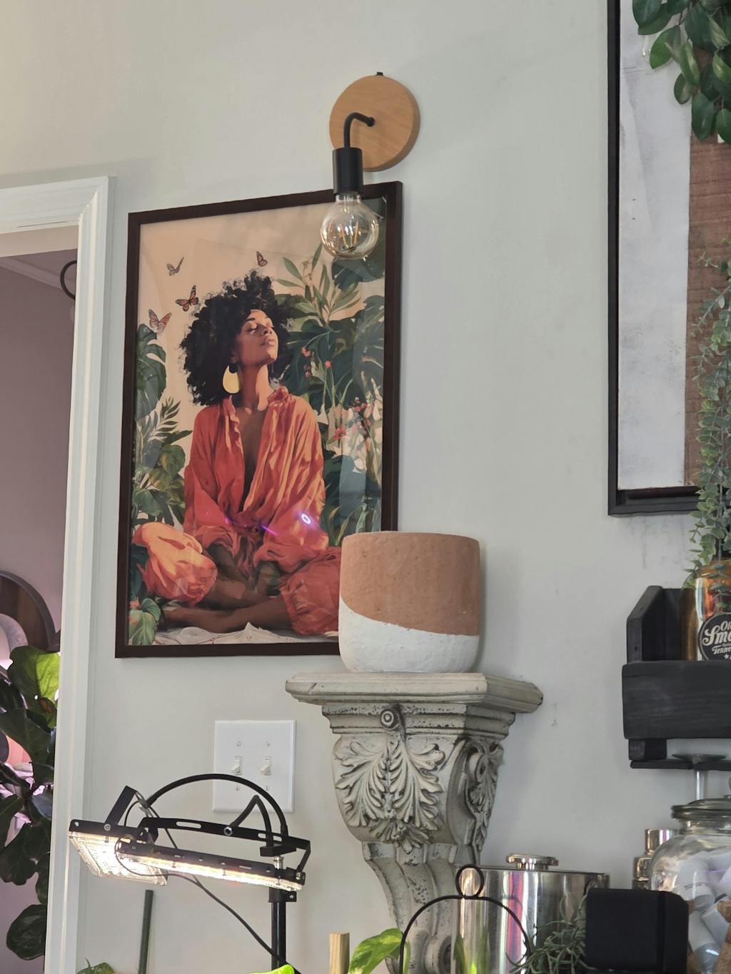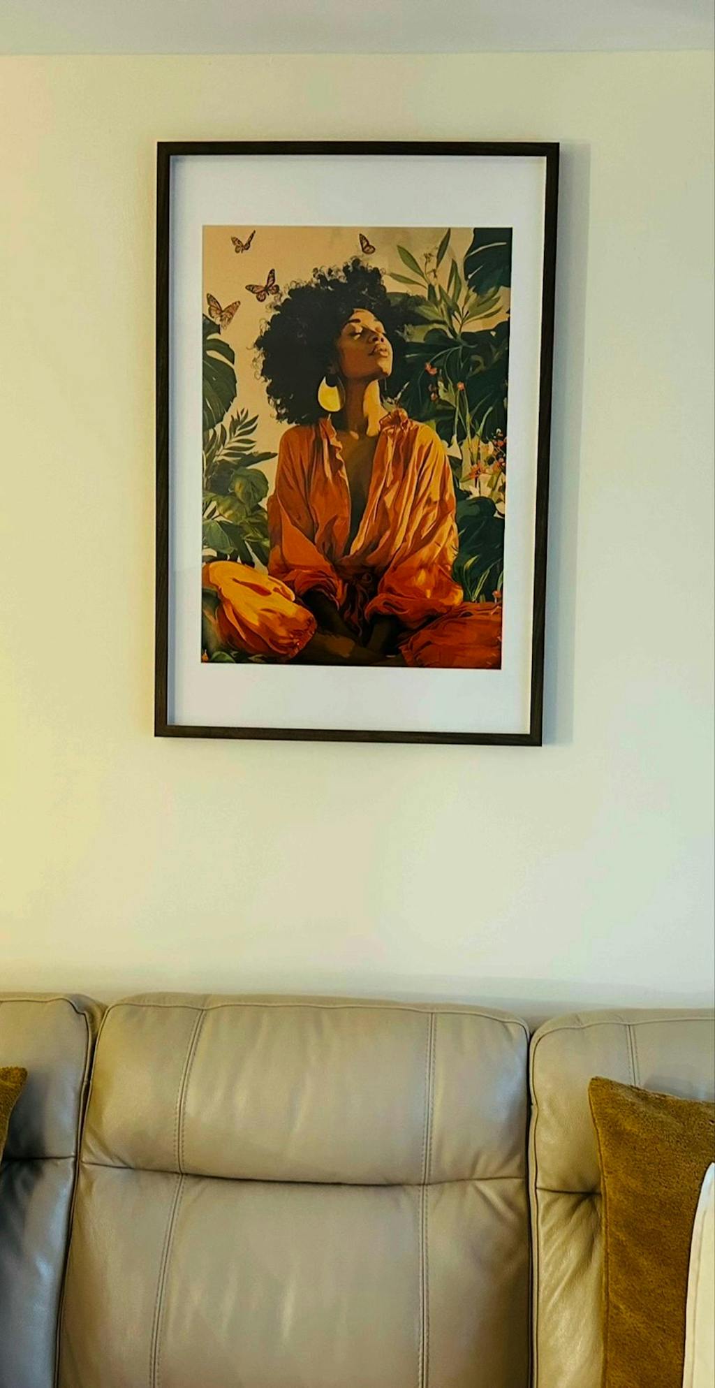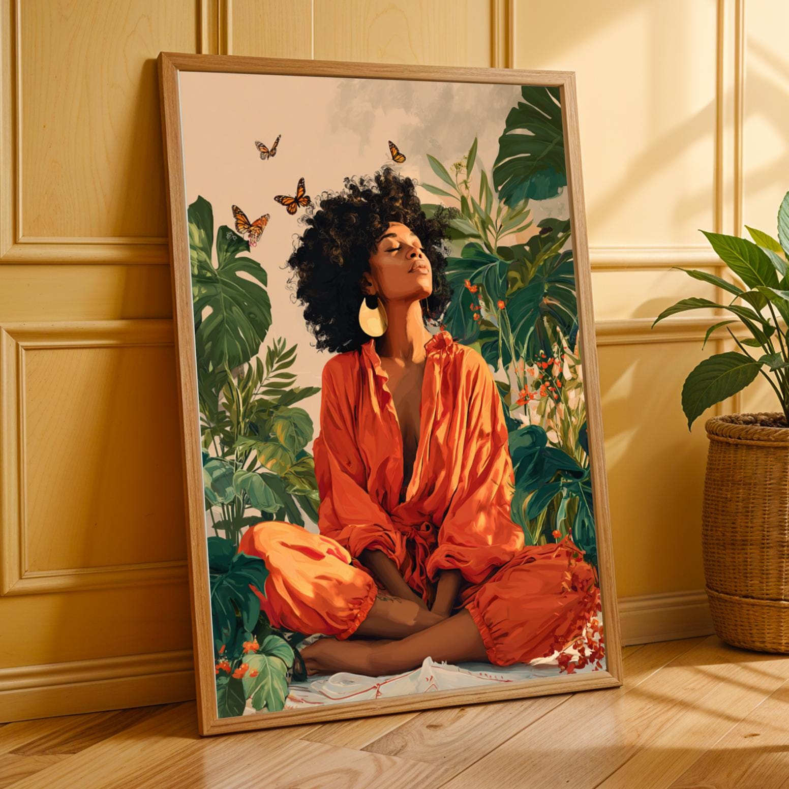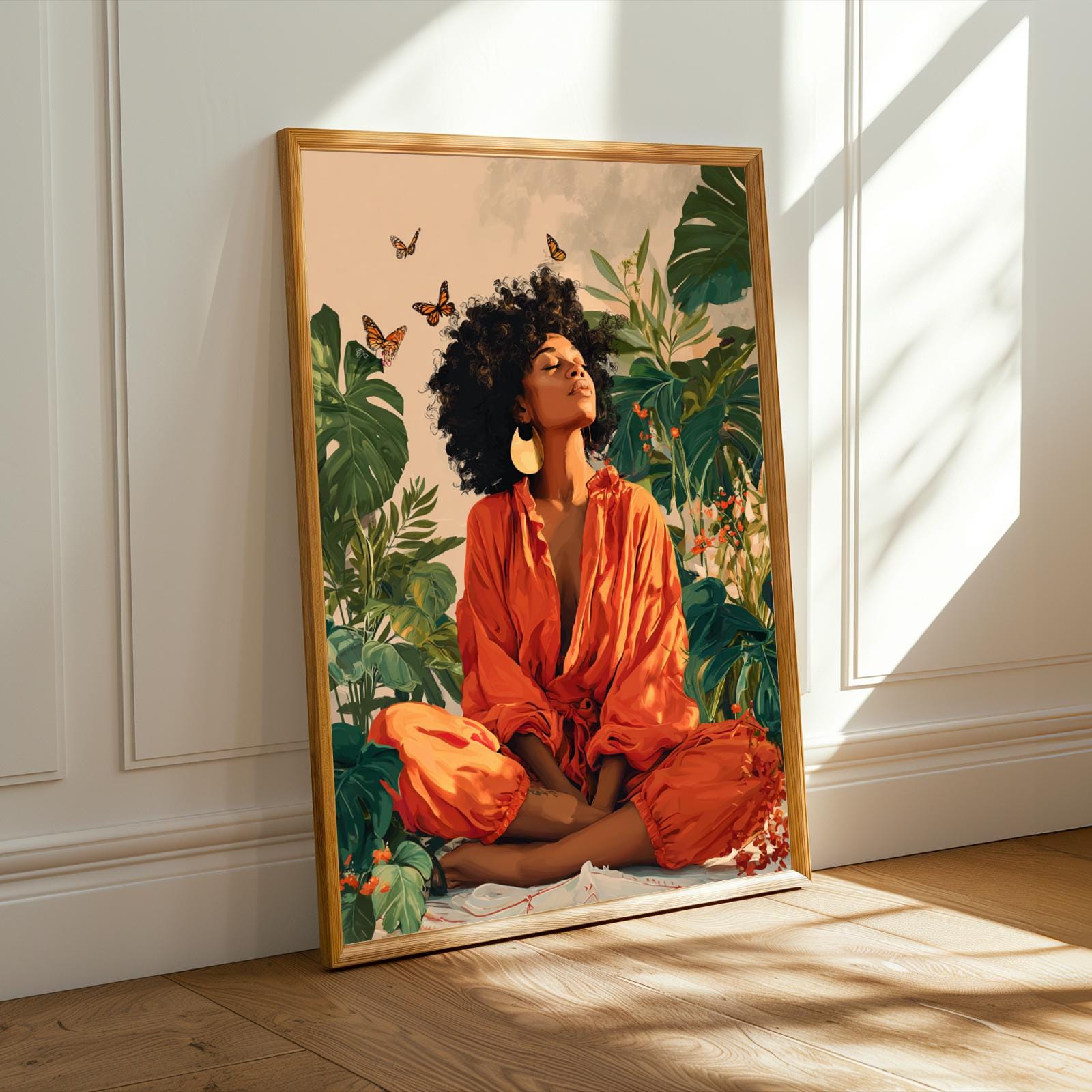 This captivating art print features a serene woman in a vibrant orange outfit, surrounded by lush greenery and fluttering butterflies, exuding a sense of tranquility and harmony with nature. The bold colors and dynamic composition create a lively yet peaceful atmosphere, perfect for adding a touch of warmth and elegance to any space.