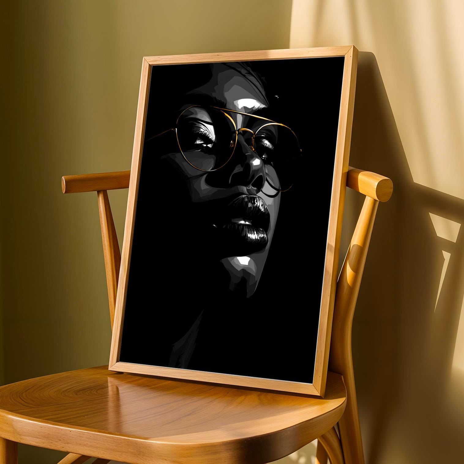 This striking art print captures a dramatic close-up of a face in deep shadow, accentuated by bold highlights and reflective gold-rimmed glasses. The monochrome palette and glossy textures create a powerful, enigmatic mood, perfect for adding a touch of sophistication to any space.