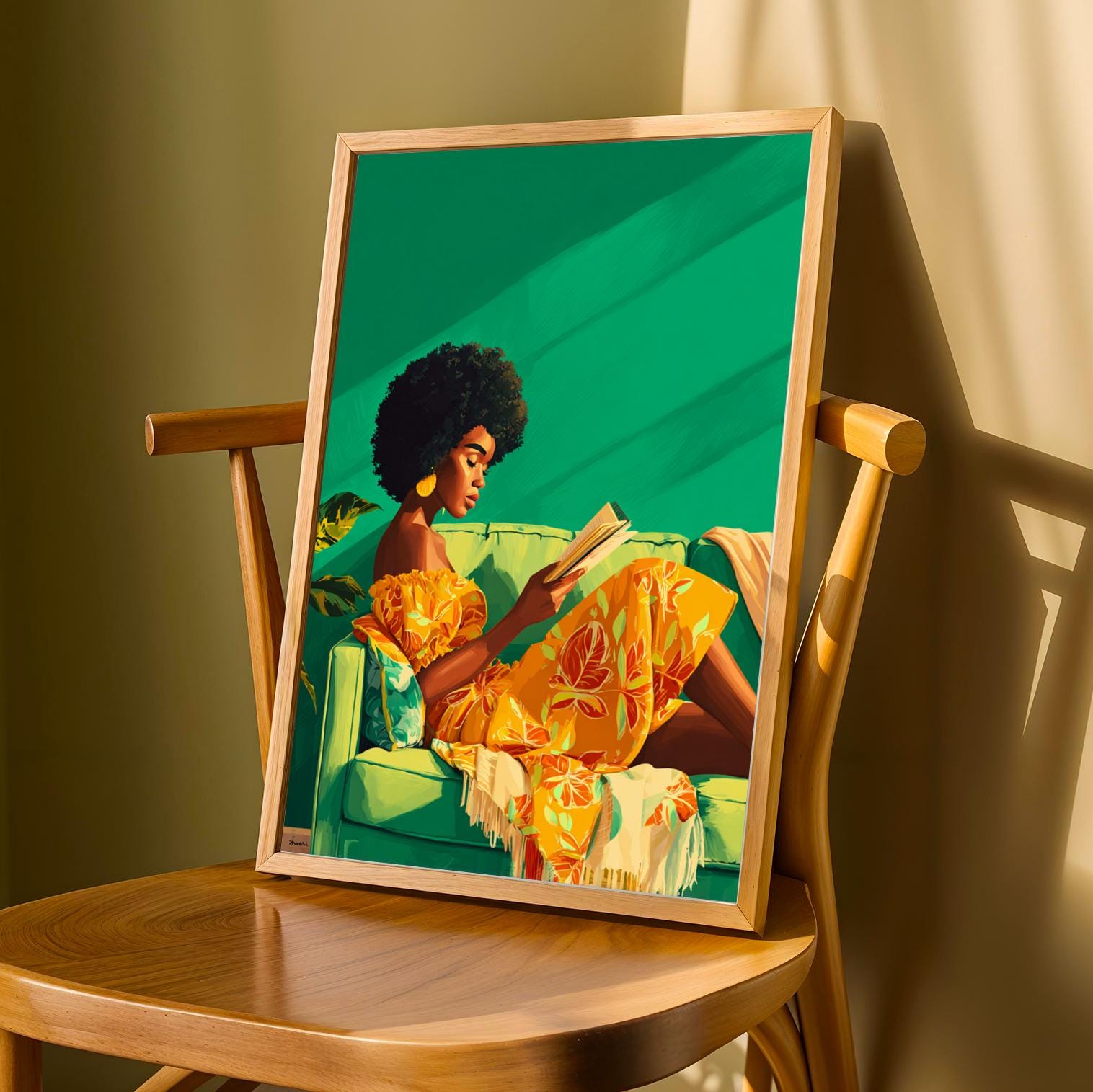 afrocentric art print, boho home decor, modern wall art, green and yellow art, orange illustration, reading woman artwork, living room decor, bedroom wall art, office art print