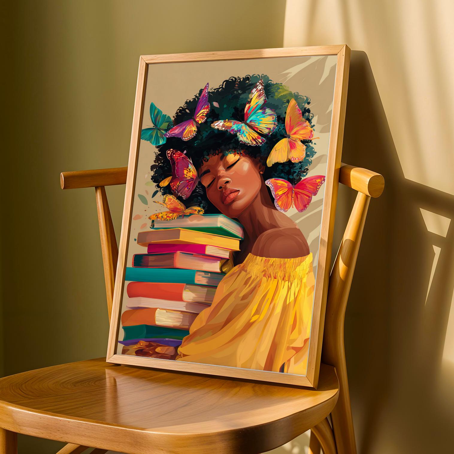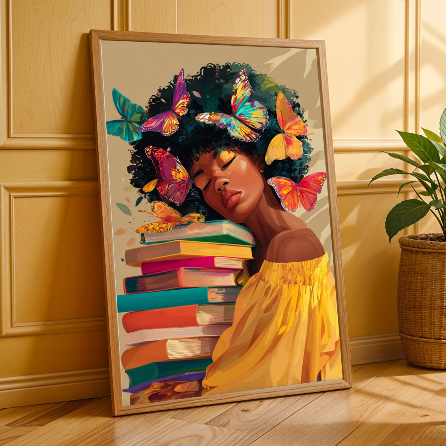 This vibrant art print captures a serene moment of introspection, featuring a woman with closed eyes surrounded by colorful butterflies and a stack of books. The bold, expressive colors and intricate details create a dreamlike atmosphere, celebrating imagination and tranquility.