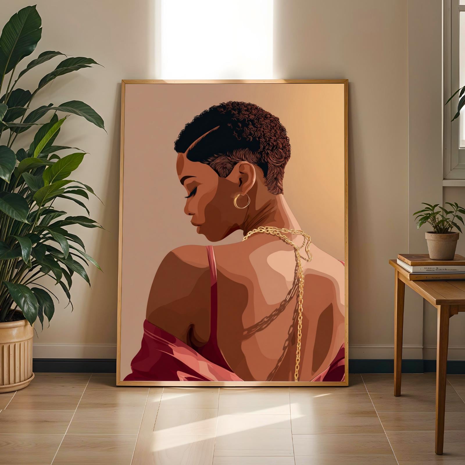 This captivating art print features a woman in profile, adorned with elegant gold jewelry that contrasts beautifully against her rich skin tones and stylishly short hair. The artwork's warm, muted palette and smooth, illustrative style create a serene and sophisticated ambiance, perfect for any contemporary space.